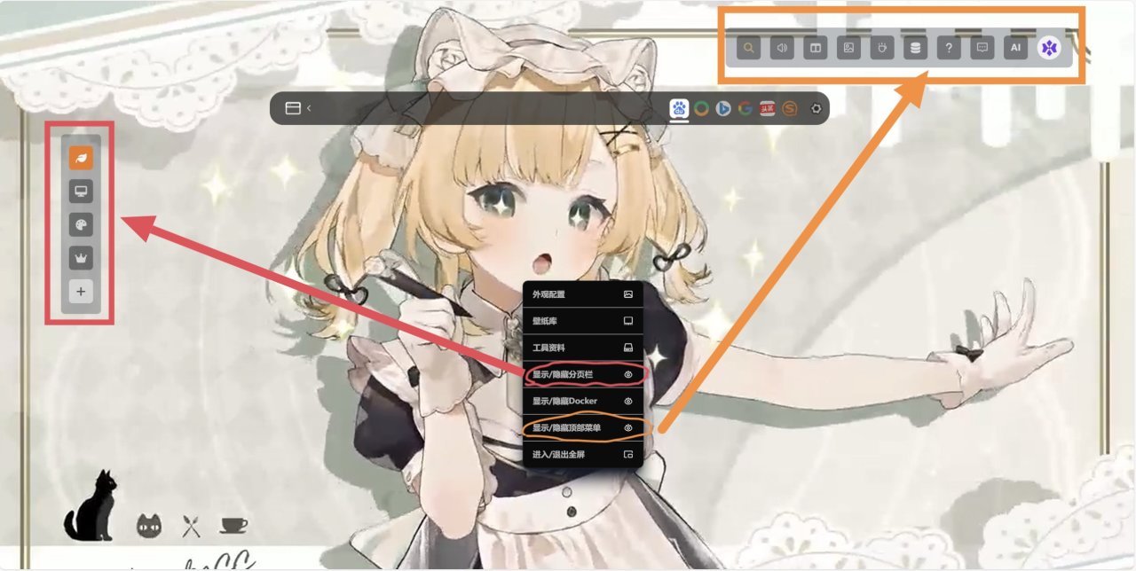 鼠標右鍵空白處,可進行隱藏左側分頁欄和頂欄的操作