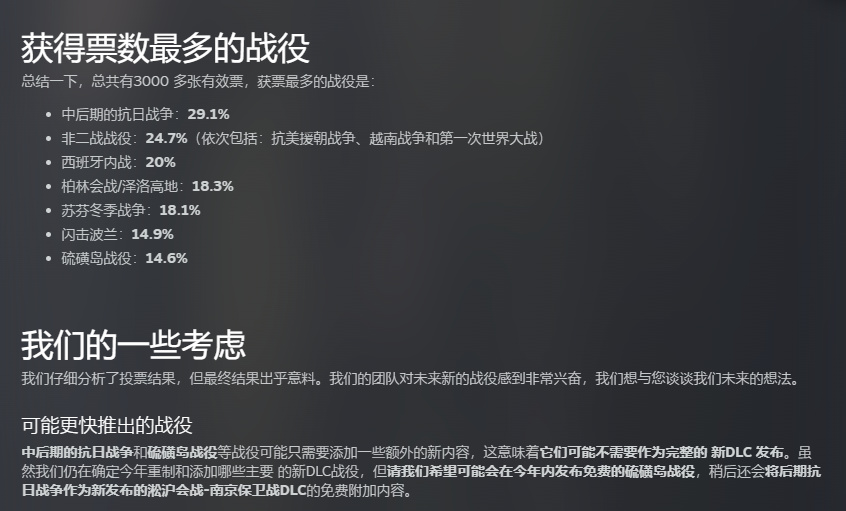 “上海-南京”DLC爆火後,馬可又啓動了一次未來戰役製作方向的投票。因爲這次投票有大批國人蔘與,“中後期的抗日戰爭”選項得到了最多票數。官方在公告中承諾,會利用好現有資產,製作抗日戰爭後期的戰役,作爲DLC的免費附加內容。