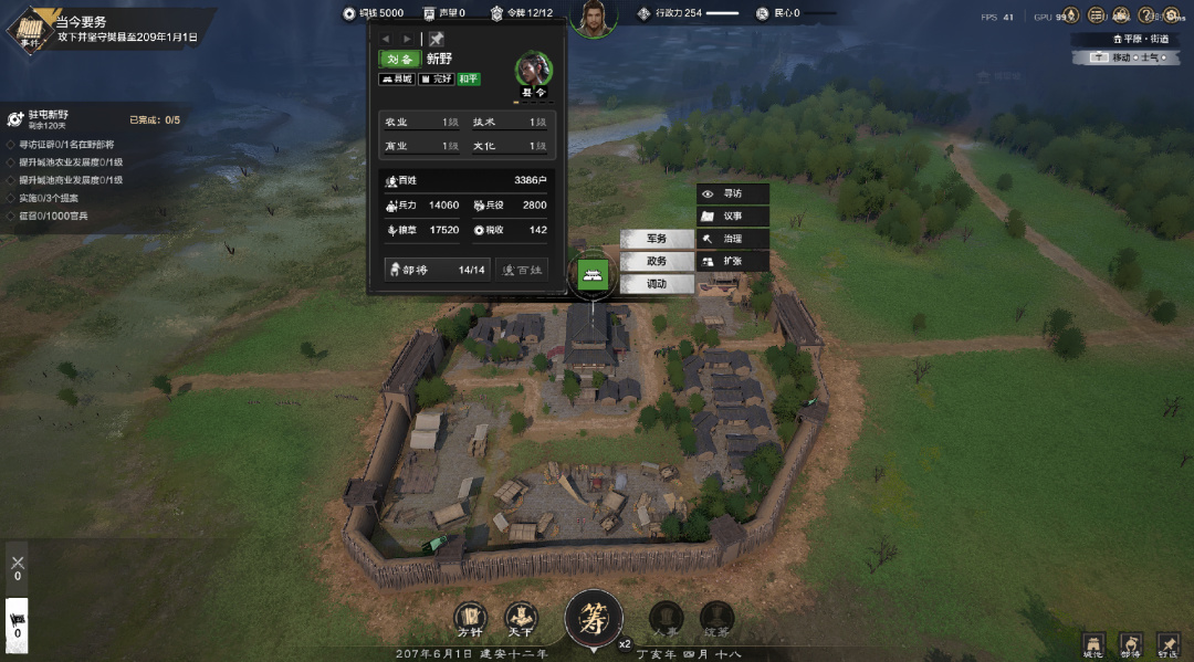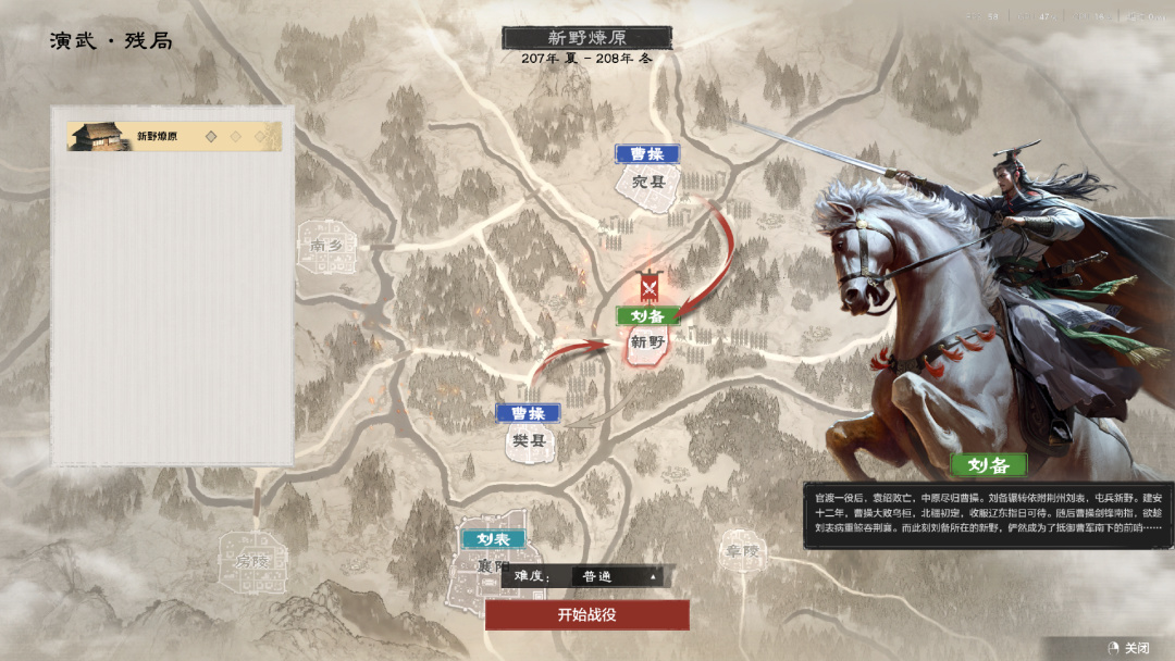 在本次Demo中,遊戲提供了“新野燎原”的殘局劇本,玩家將扮演劉備一方,來抵禦曹操的南下進攻。無論是從軍事實力,還是資源產量,一上來玩家很難與曹操方硬碰硬,所以玩家的首要任務,便是需要在有限的時間內快速發育,頂住曹操大軍的衝鋒,並拿下樊縣,尋找破局的機會。因此在這場劇本中,內政發展便成爲了重中之重。