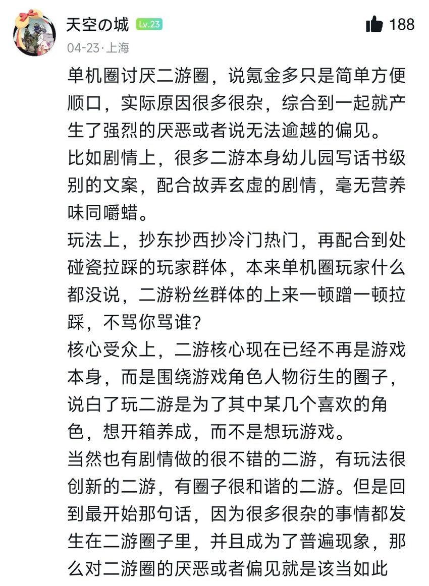 國內二遊已經成熟了的遊戲製作工藝,必須要靠氪金抽卡瘋狂吸金,才能持續運作嗎?難道換一種獲利方式就養不起了嗎?氪金抽卡導致對角色傾注了大部分開發資源,進而導致遊戲其他方面嚴重薄弱,已經到了畸形的地步。現今最頂級的二遊,其商品屬性遠大於藝術性,這樣的二遊會一直難登大雅之堂,這也是爲什麼遊戲鄙視鏈中二遊處於一個很低的位置。