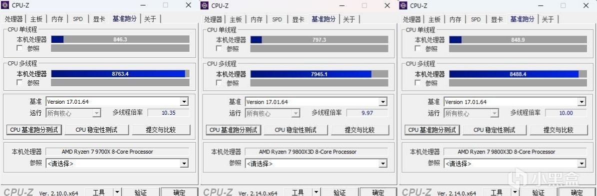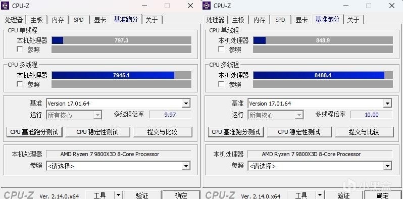 ▼對比下解鎖功耗的9700X,跑個CPU-Z的性能測試,9700X解鎖功耗單核846.3、多核8763.4,9800X3D在PBO2後,單核848.9、多核8488.4,單核性能和僅解鎖功耗的9700X接近,多核要弱一些。
