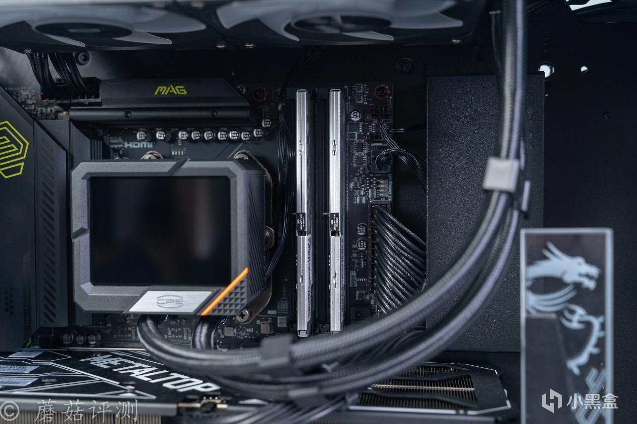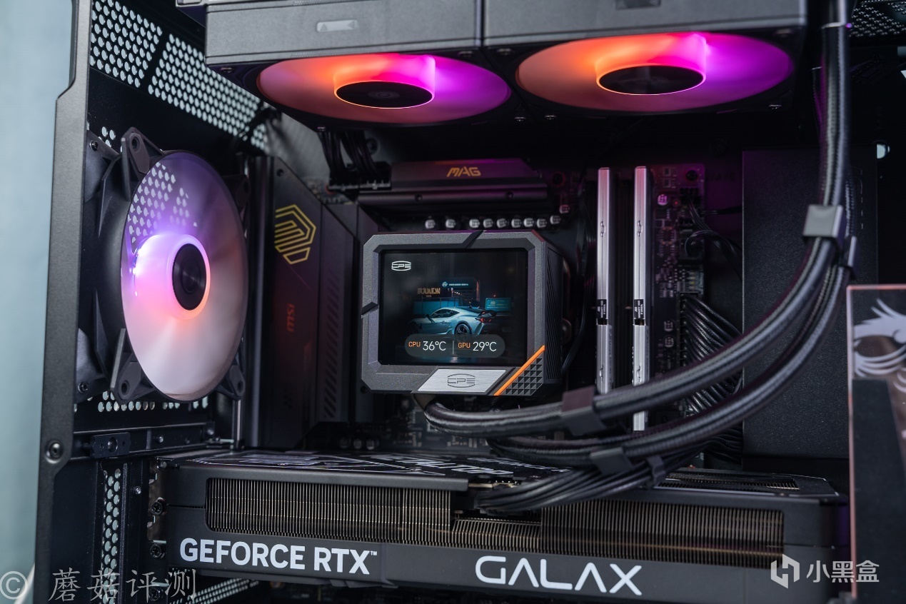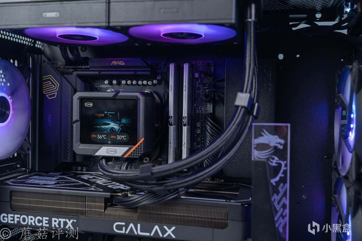 ▼用來壓制9800X3D的是超頻三的北境GT240水冷,這款水冷的散熱效能十分出色,且水冷頭頂部標配一塊3.5寸的屏幕,顯示效果很細膩,功能性和顏值都很棒。