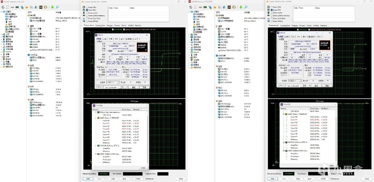 ▼待機我們這裏就不看了,跑個CPU-Z的壓力測試,解鎖功耗的情況下,處理器功耗在110W左右,全核心睿頻5.25GHz,溫度66℃。PBO2之後,處理器功耗提升到140W,全核心睿頻5.325GHz,溫度80℃。