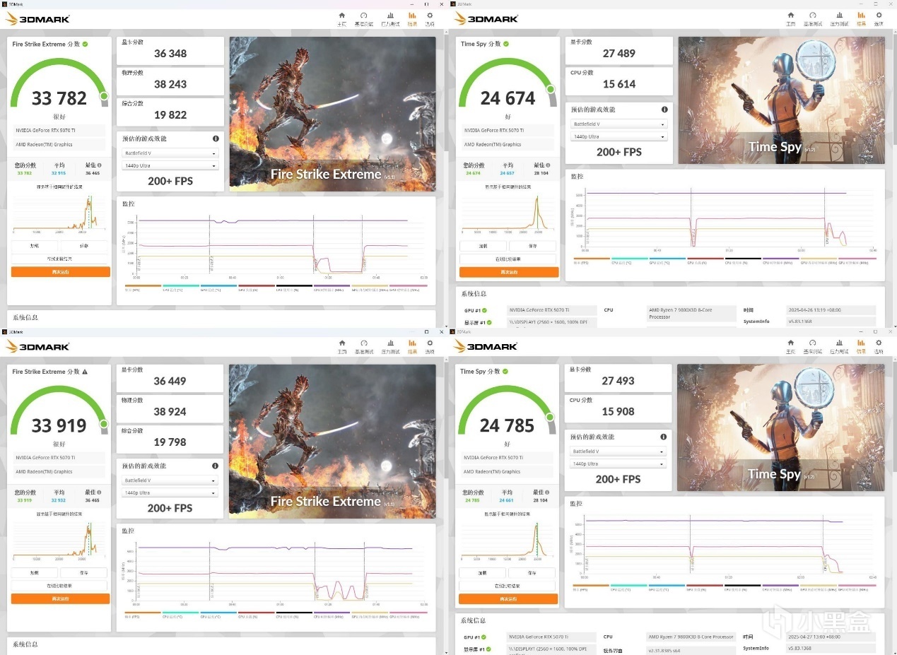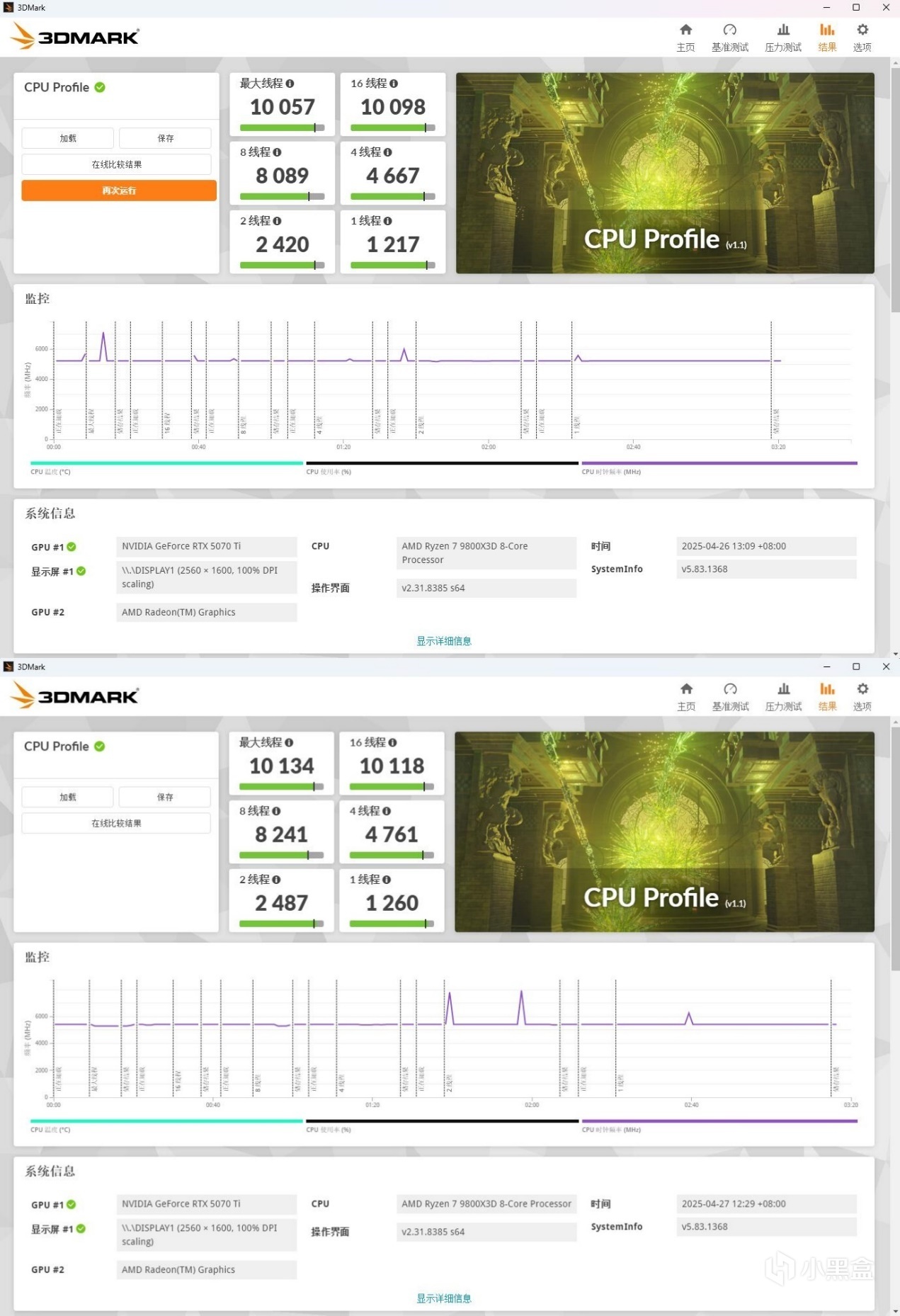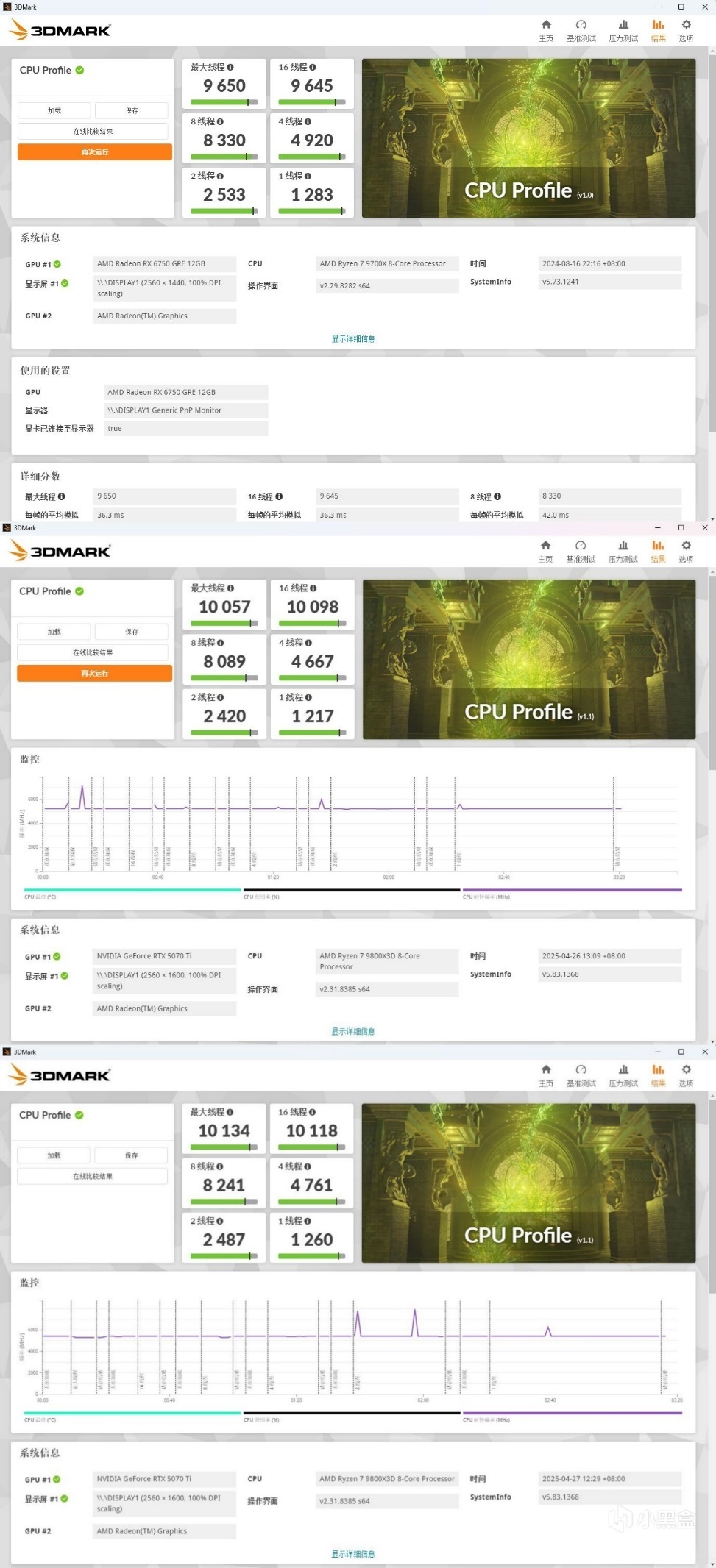 ▼跑個3Dmark的CPU測試,1線程性能一直到8線程性能,解鎖功耗的9700X都要更強一些,但在16線程和最大線程性能方面,9800X3D要更強一些,更大的緩存看樣對超線程效率有提升。