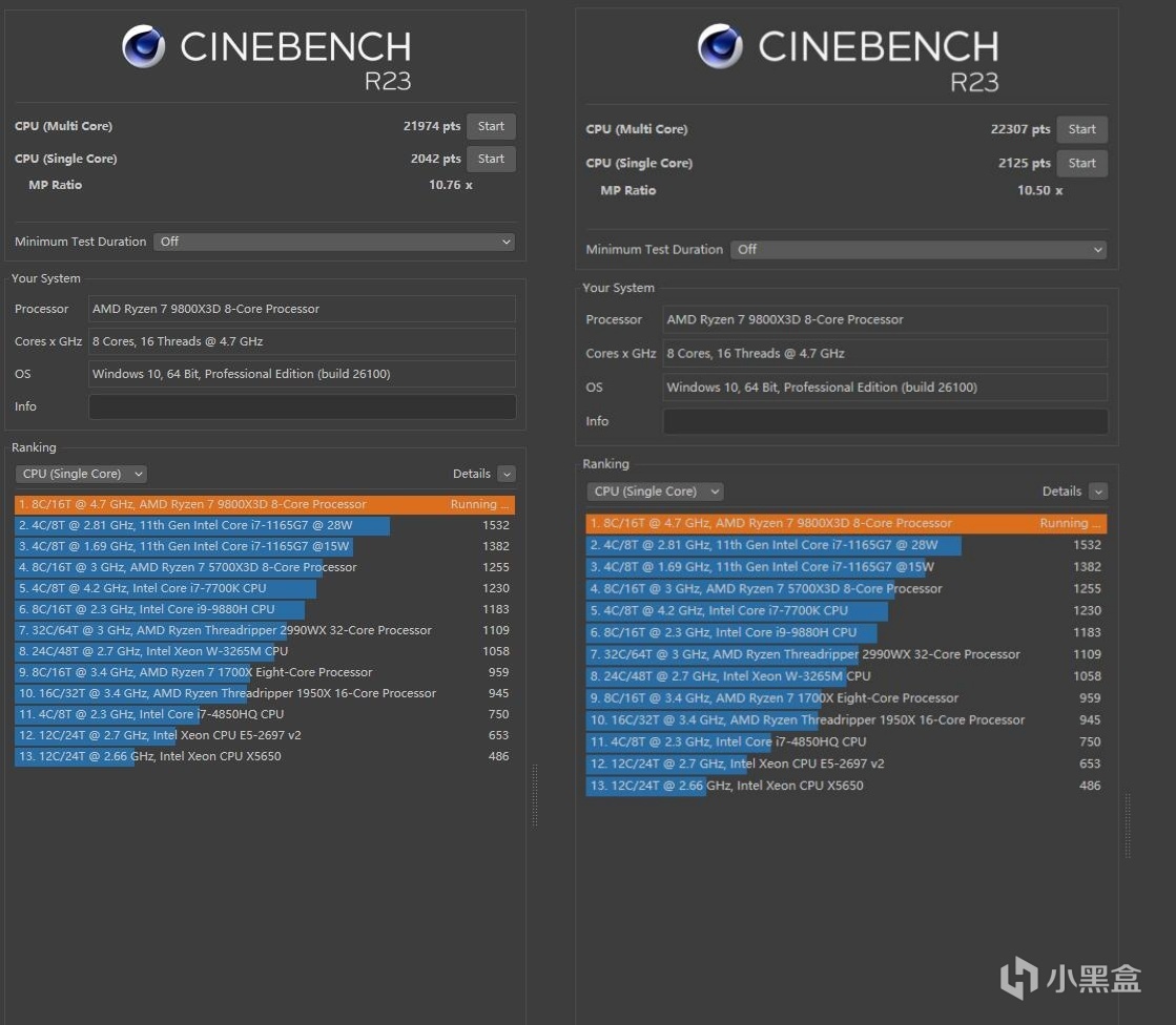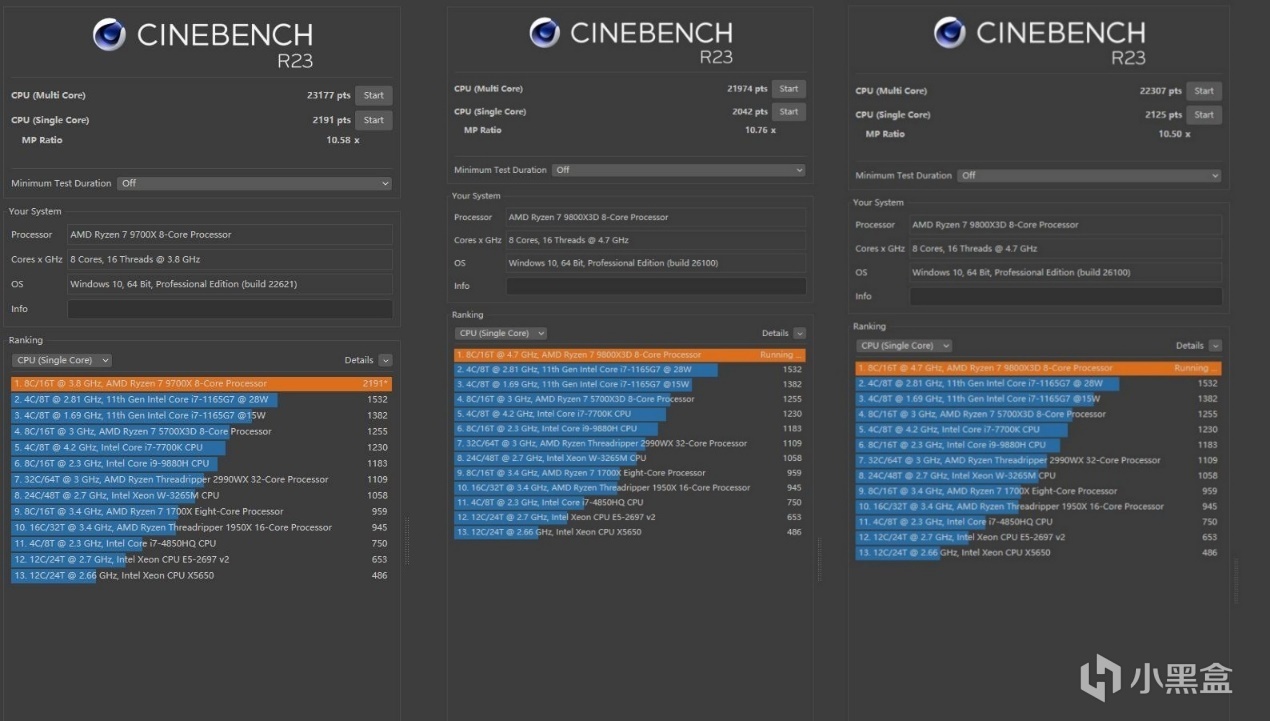 ▼跑個CineBench R23測試,9700X解鎖功耗單線程2191,多線程23177,PBO2的9800X3D單線程2125、多線程22307,稍微落後於9700X。