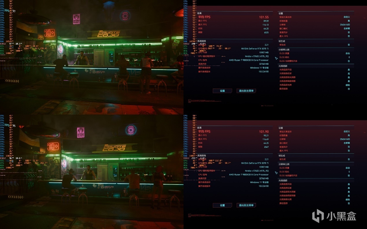▼接着是大型3A遊戲,賽博朋克2077,2K分辨率,光追超級畫質,“拼好幀”關閉,默認情況下,整體的平均遊戲幀數在101.55幀左右,PBO2後,整體的平均遊戲幀在101.9幀左右。