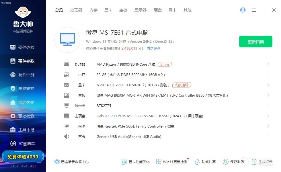 ▼整機配置一覽,處理器是9800X3D,主板是微星的B850M迫擊炮,顯卡是影馳的RTX 5070 Ti金屬大師黑金版OC,整機配置還可以。