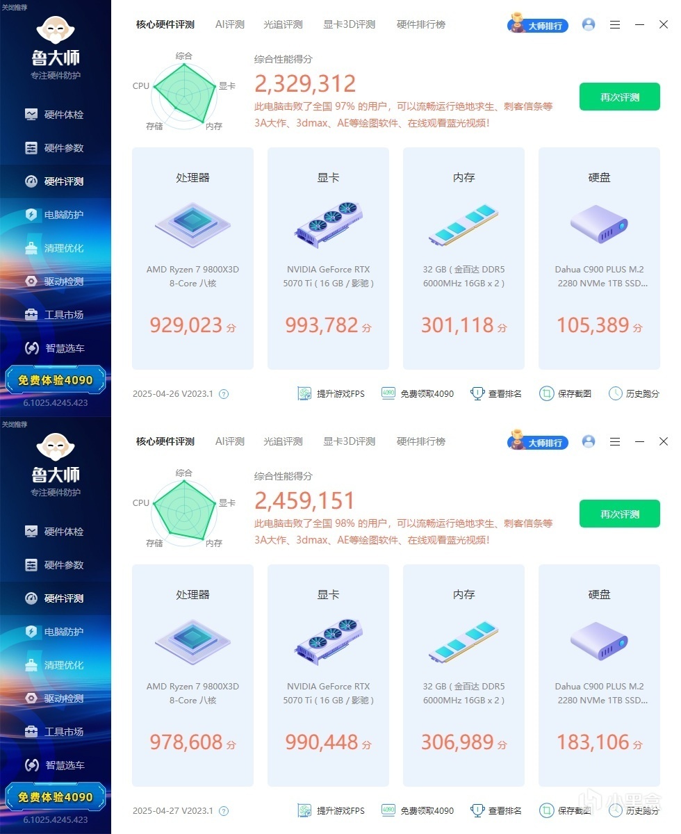 ▼簡單跑個魯大師的整機測試,整機得分分別爲232W和245W,其中處理器單項得分提升蠻大的,從92.9W,提高到97.8W。