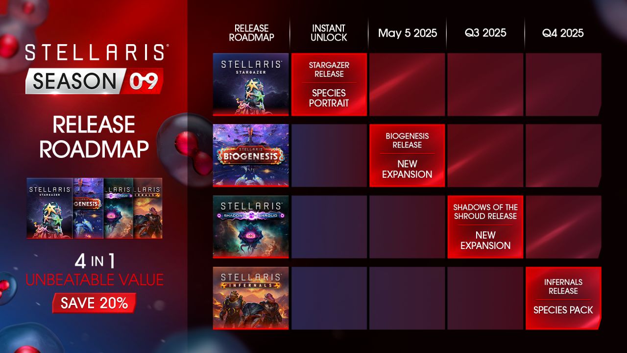 早在上个月,P社就开启了《群星》第九赛季,玩家可以通过购买通行证享受8折优惠。P社官方称:“拓展通行证是您通向宇宙演化、灵能秘辛和天启炼狱的星门年票。该扩展票将立刻解锁专属观星者物种头像,并带来游戏的三个主要DLC,包括对生物飞升和灵能飞升的重新定义,以及目前为止最雄心勃勃的物种包!购买该拓展票将在全部四个DLC发布的第一时间解锁。”