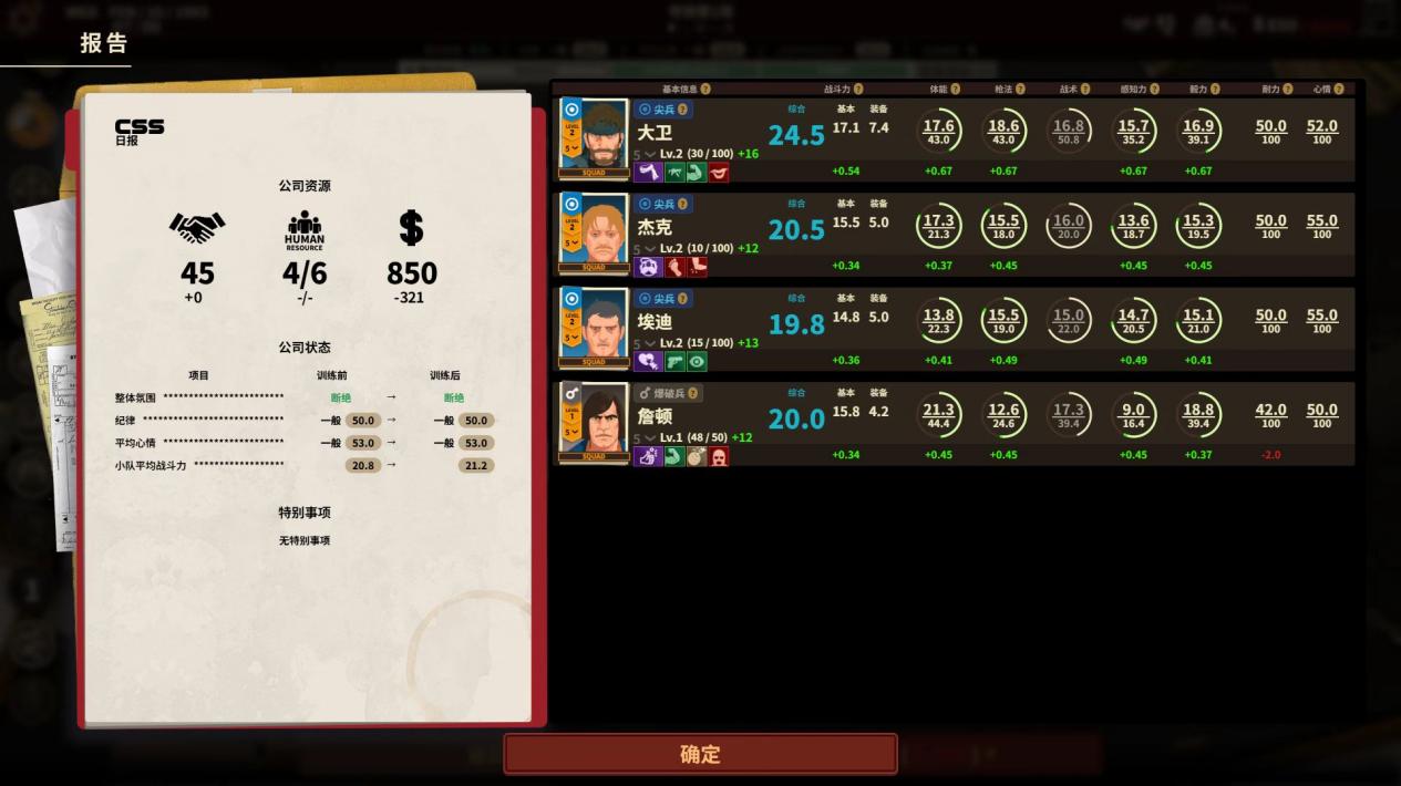 僱傭兵的養成部分也十分豐富,每天給隊員安排相應的訓練計劃,根據各自的性格和定位因材施教,先鋒兵體能鍛鍊拉滿,狙擊兵更加專注於槍法練習。