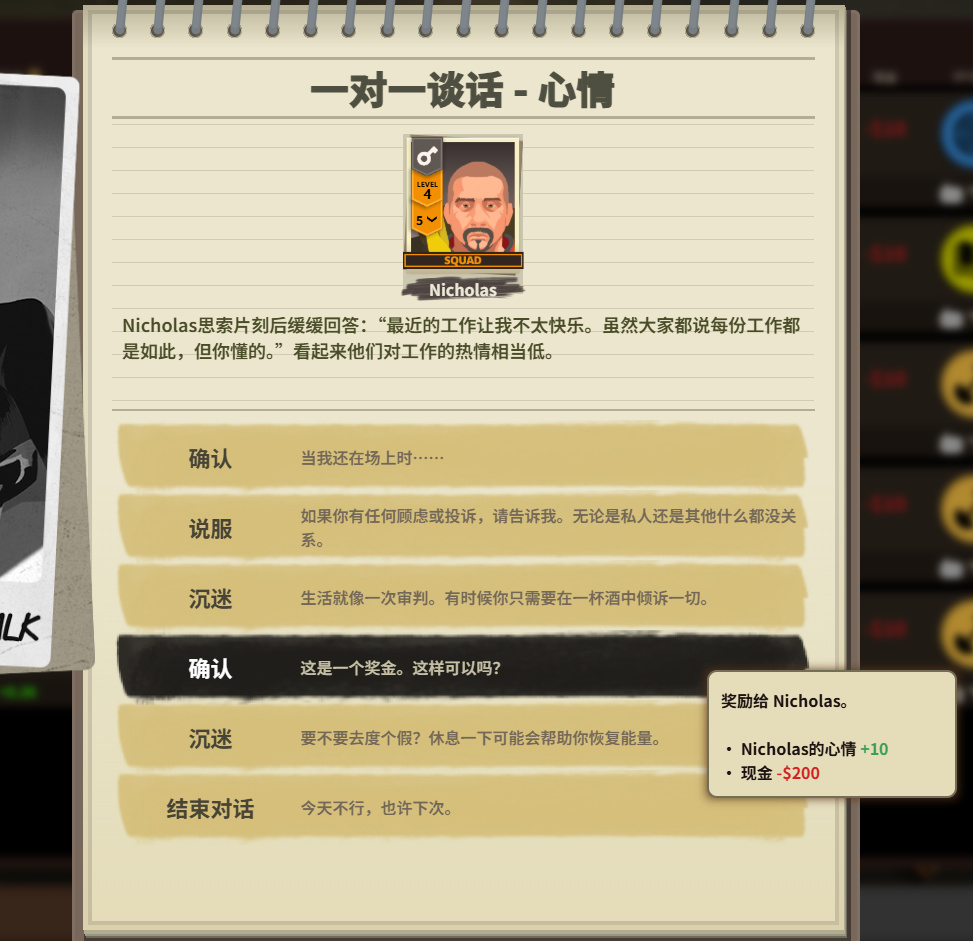 二是這種互動能給僱傭兵們帶來很多“活性”,不管是戰鬥時候的碎碎念,還是訓練途中的各種小心思,看着他們邊打槍邊哭喊“媽媽我不想死”,或者下了班總想拉着我喝上兩杯,都能讓他們變成一個活靈活現的人呈現在面前,而不是擁有詞條的“一張卡片”而已。