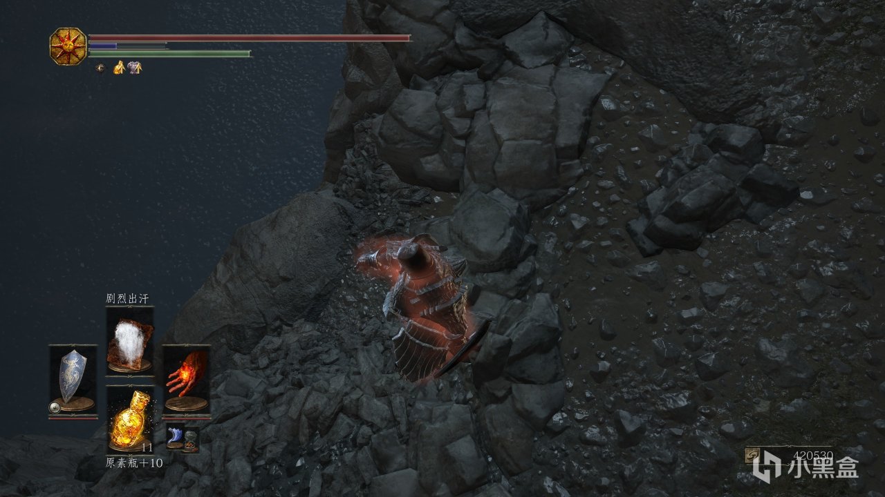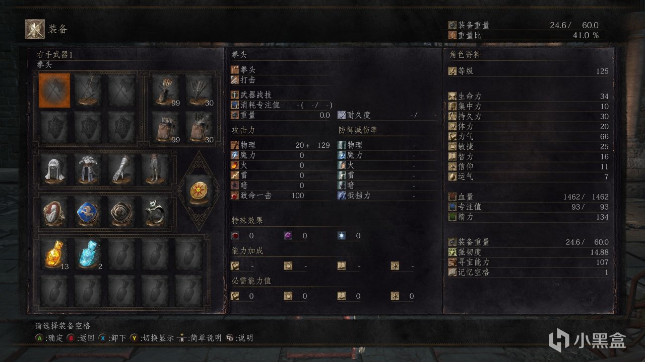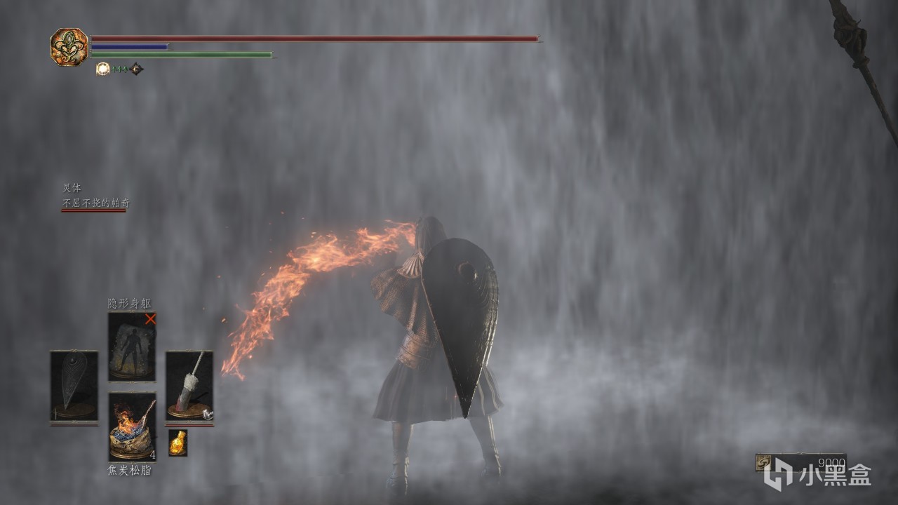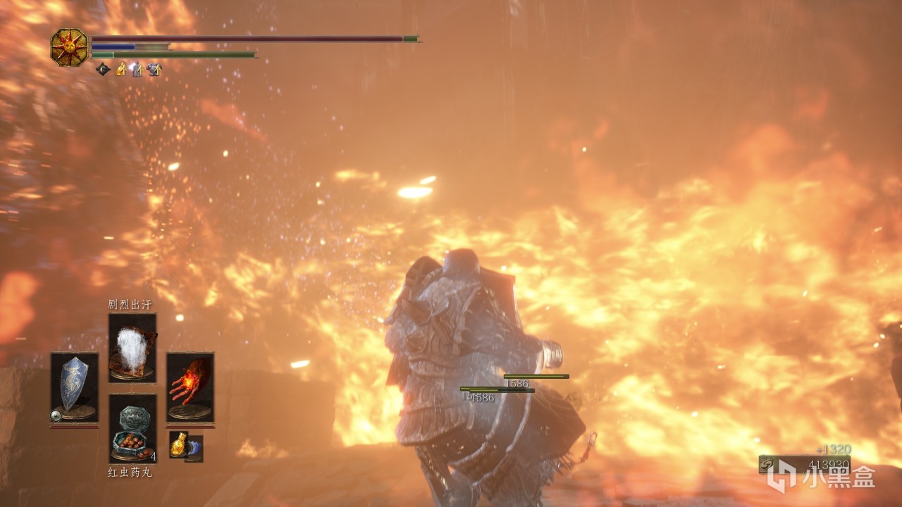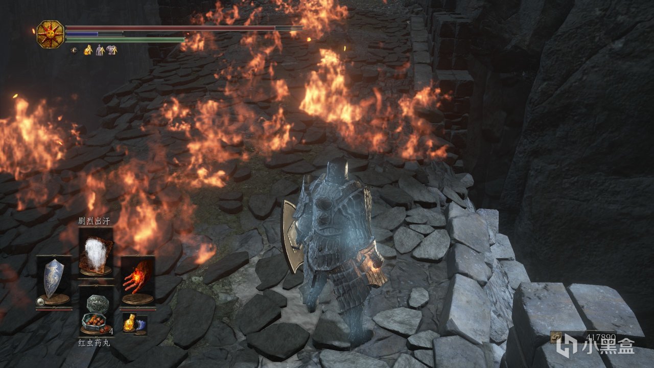 黑鐵頭,哈維爾甲,羽翼騎士手,黑鐵腿,火方石戒指,劇烈流汗,火抗89的龍圖紋盾,紅蟲藥丸