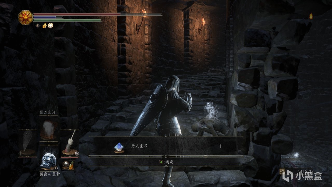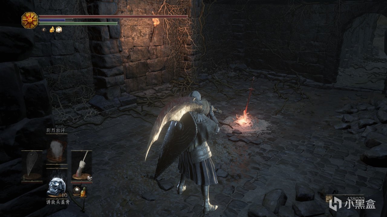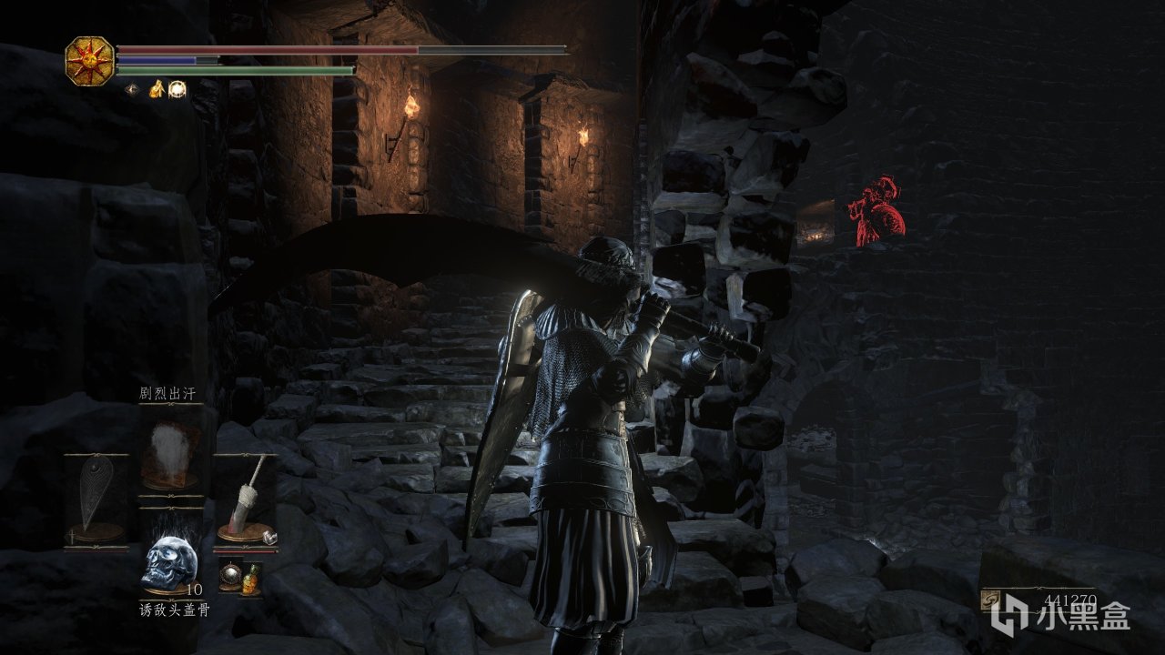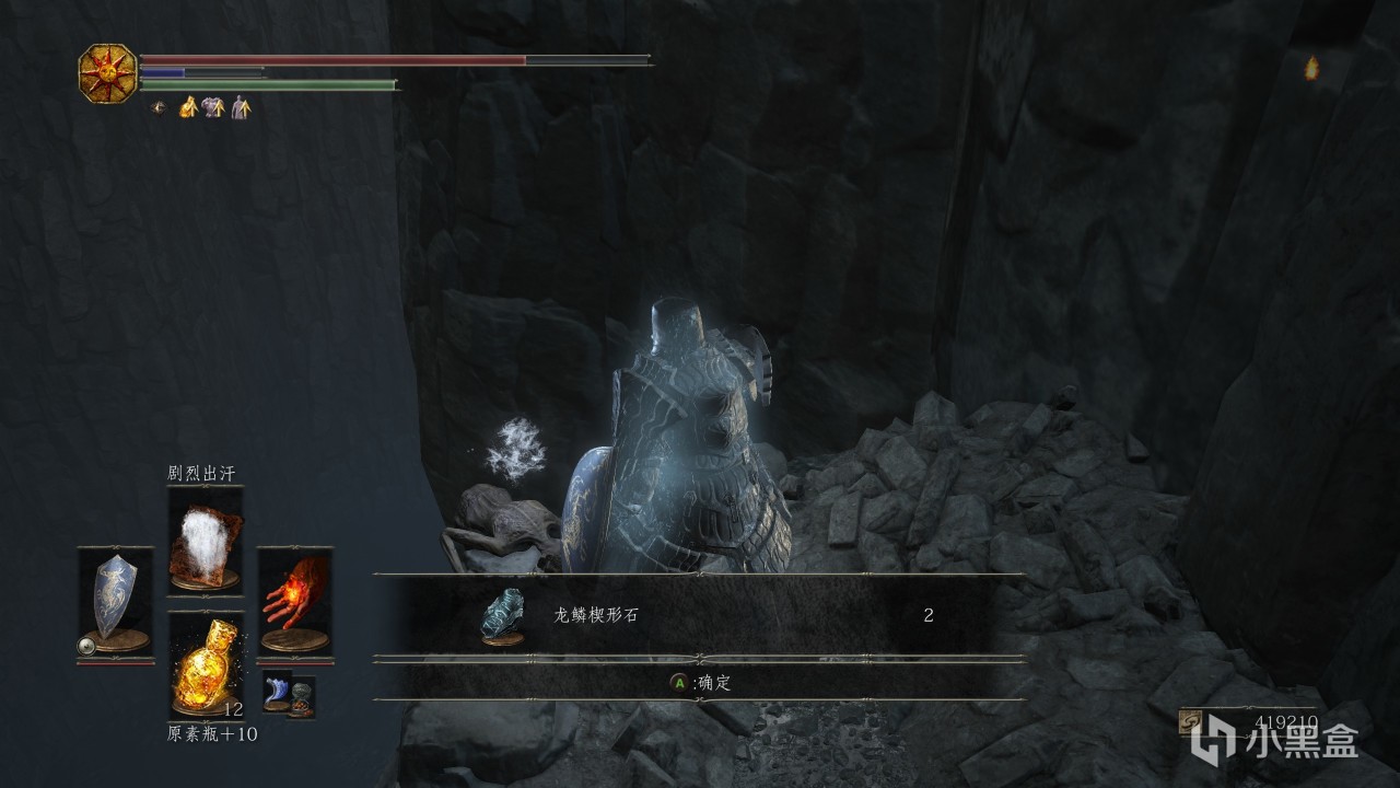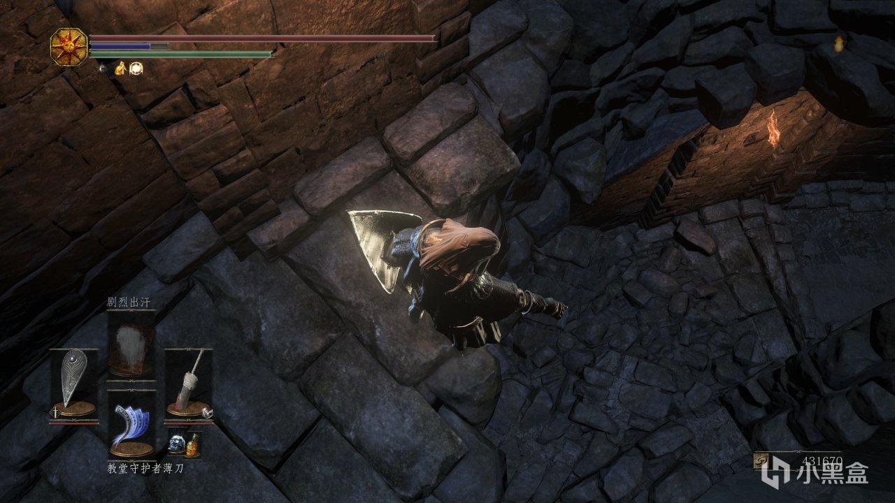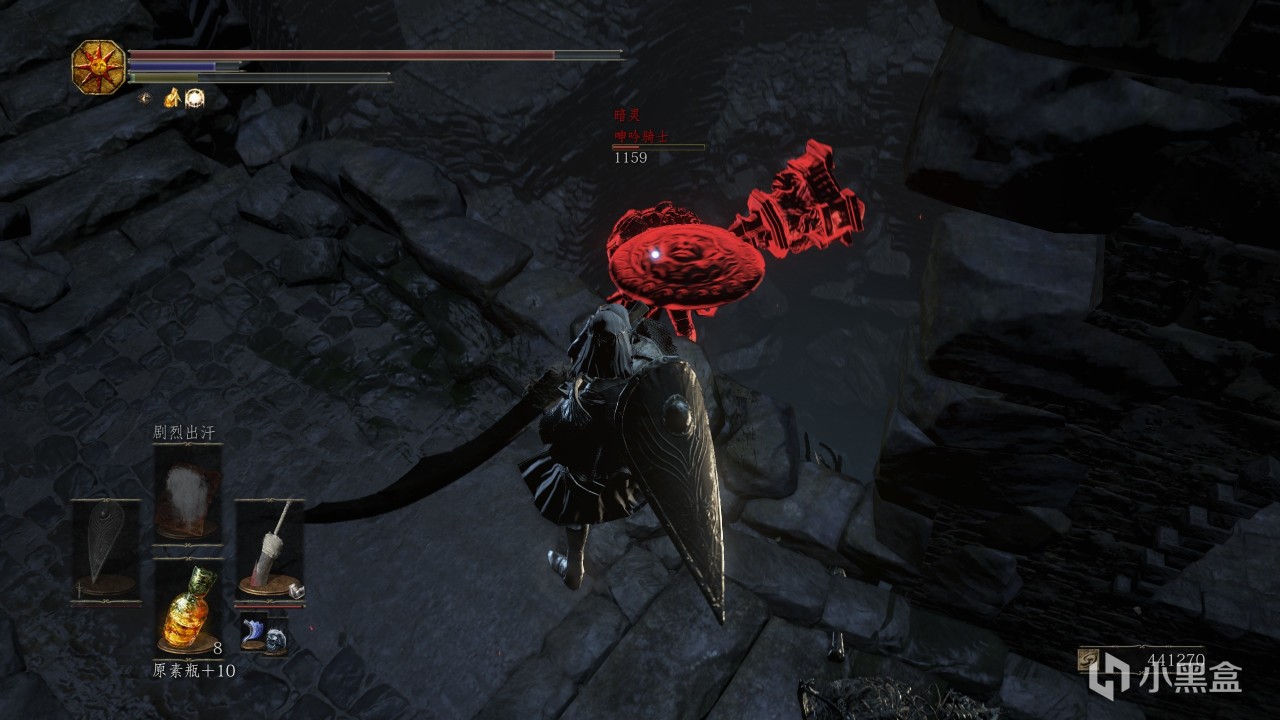 黑鐵頭,哈維爾甲,羽翼騎士手,黑鐵腿,火方石戒指,劇烈流汗,火抗89的龍圖紋盾,紅蟲藥丸