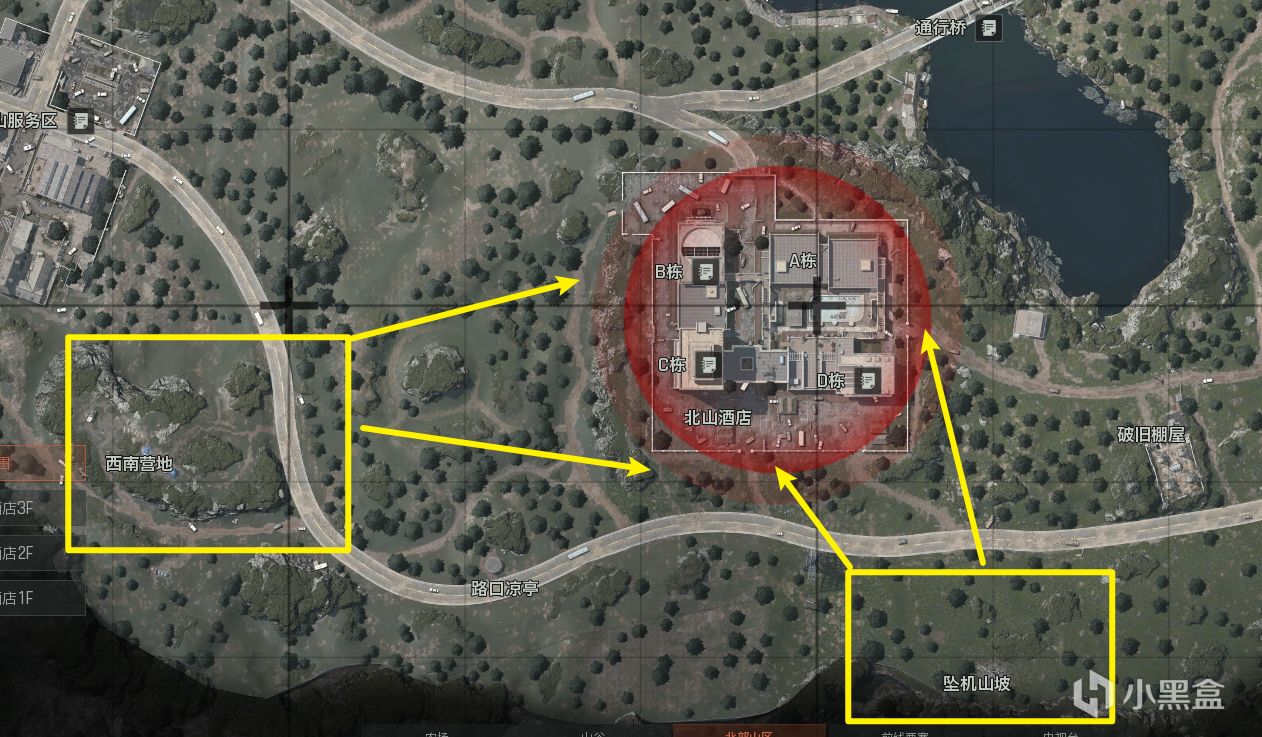 要注意的是北部山區入口可以被西南營地和墜機山坡狙到,出入酒店時請格外注意,如果有隊友的話儘量走一起不要落單。