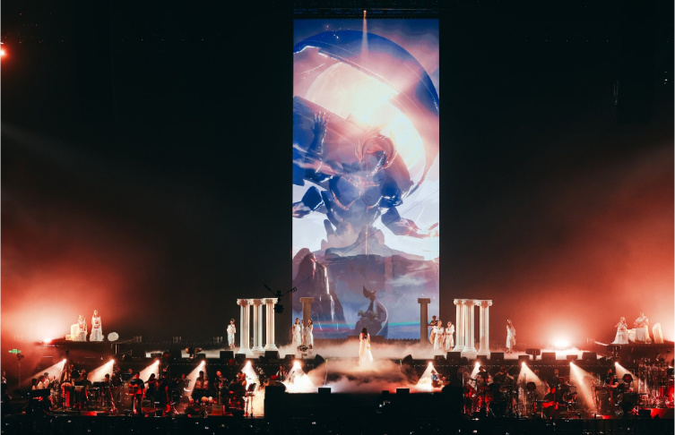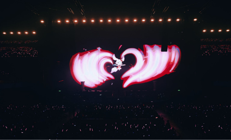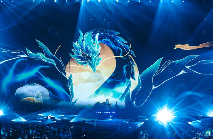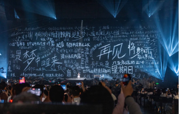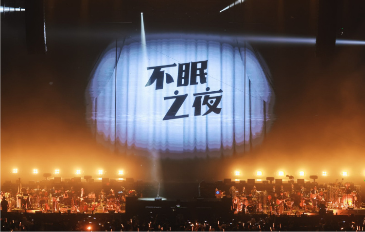 而在《不眠之夜》結束後,現場熱度絲毫不減。《水龍吟》、《希望有羽毛和翅膀》、《何者》,每一首經典曲目的前奏響起,都足以令全場沸騰,無數的聲音交織成萬人合唱,舞臺佈景、光效也隨着歌曲變換,時而是仙舟羅浮的恢弘,時而是匹諾康尼的繁華,再轉眼又成了翁法羅斯的古典,引領着我在每一顆充滿回憶的星球中穿梭。