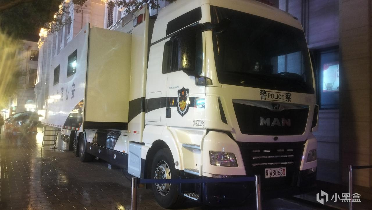 看到了一輛平常絕對看不到的警車——德國的MAN TGX Euro 6 6x2(也被稱爲MAN TG2 TGX,2007年發售的TG系列的第二款車型)警用改裝版,裝配固特異S GEN-2卡車輪胎,原裝MAN螺絲,屬實牌面。