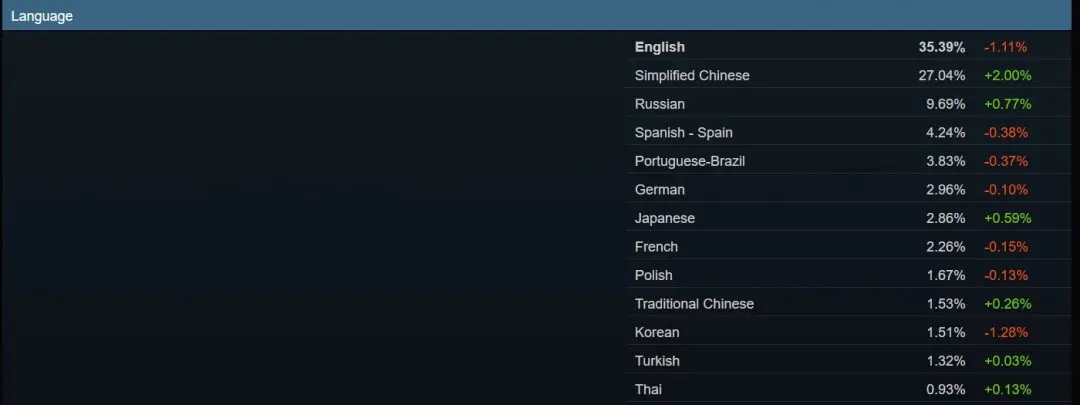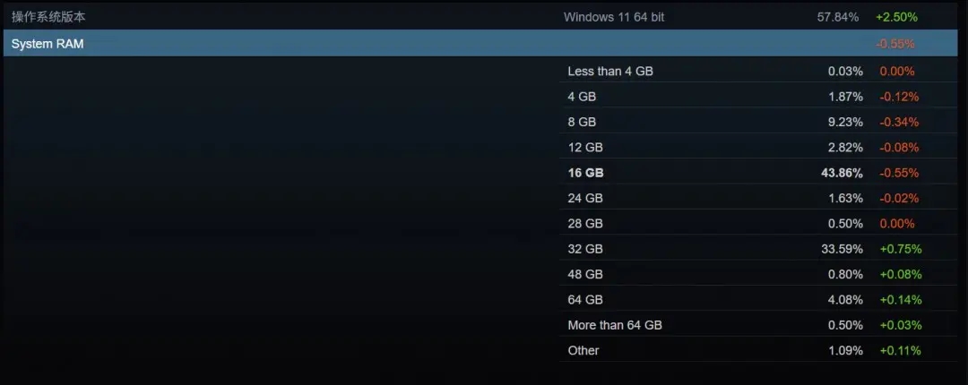 操作系統方面,Windows 11 64位以57.84%的佔比穩居第一,較3月大漲2.5%;內存配置上,16GB雖仍是主流(佔比37.65%),但32GB陣營崛起(23.14%,月增0.75%)。語言層面,中文用戶佔比達27.04%,月增2%,直逼英語(35.39%),俄語、日語等亦呈增長態勢。