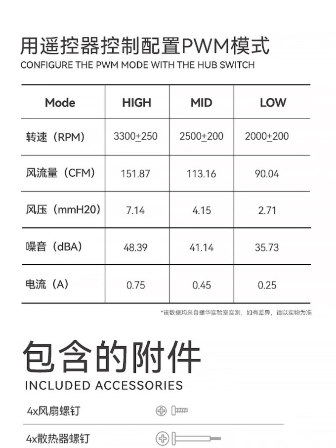 風扇本體上沒有任何關於電流的信息,包裝正/背面的醒目位置,也並沒有寫上具體能耗。關於“風扇功耗”的所有內容,只在側面那“用遙控器配置PWM模式”的表格中被短暫提及。倘若並未仔細閱讀每一個角落,用戶將無從知曉風扇的電流數值。
