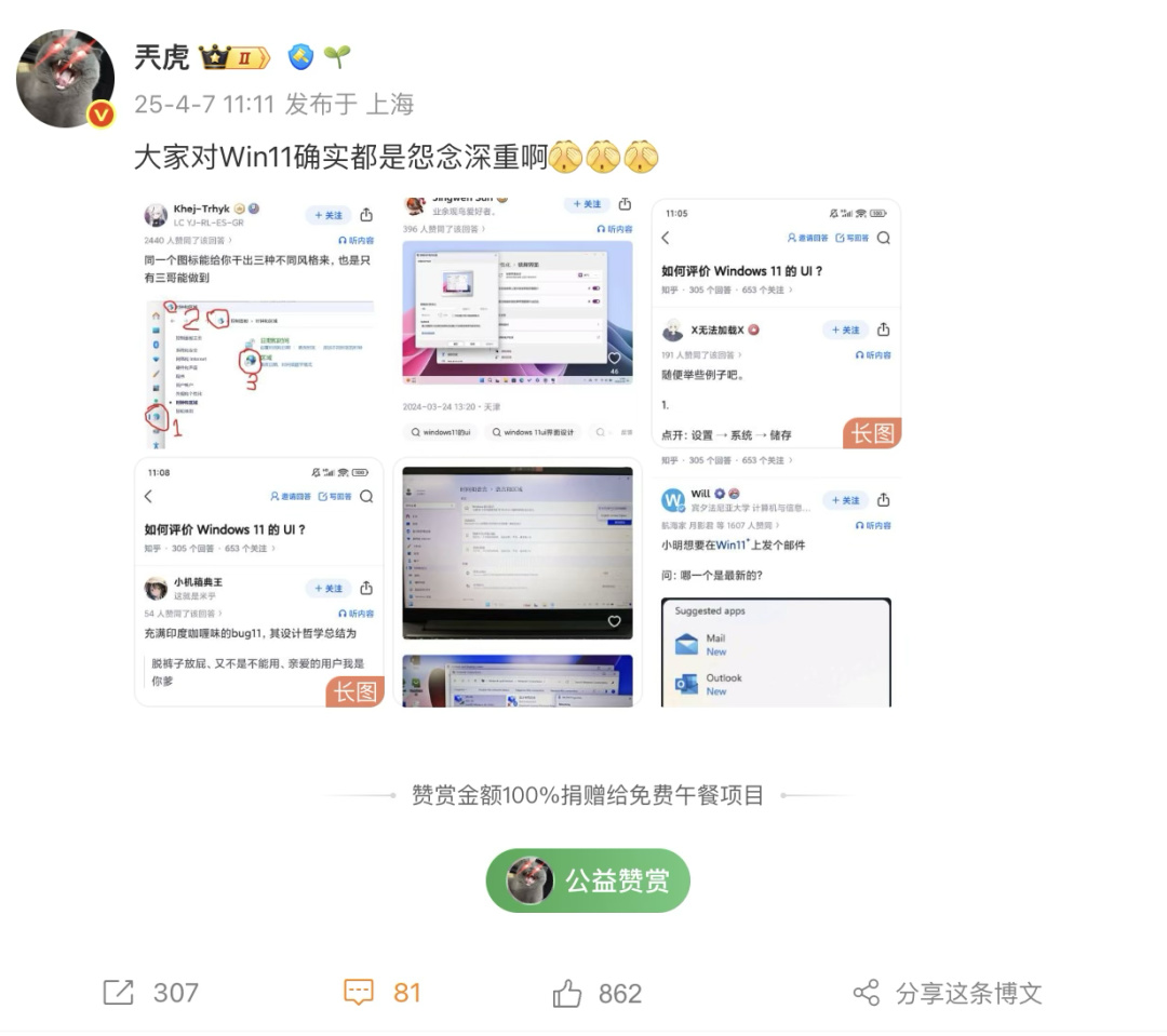 這個問題的評論區還被轉發到了各大平臺。有人把它發到微博,說大家對 Win11 確實怨念深重。