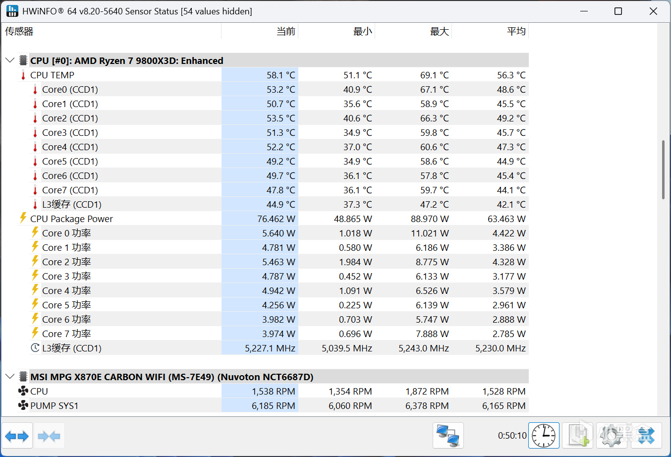 在近一个小时游戏体验中(包括首次编译、读档和游戏全程),终越视界360 UB ARGB水冷压制效果出色,9800X3D最高温度为69℃,平均温度只有56℃,,CPU风扇最大1872RPM转速,平均只有1528RPM转速。