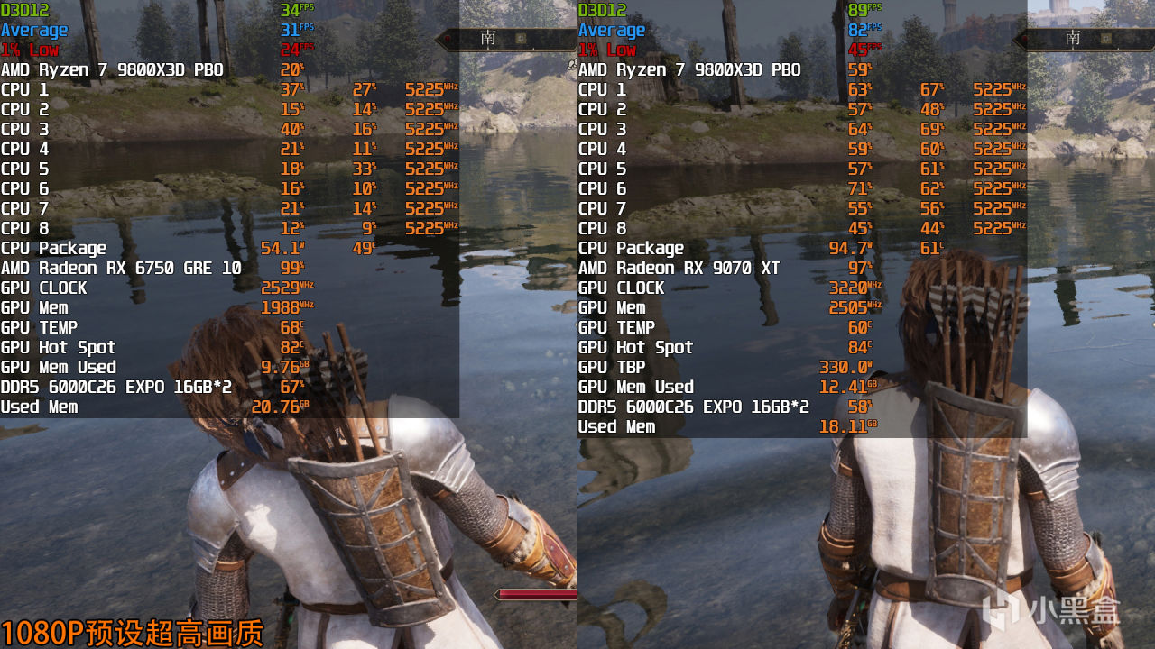 从OSD监控信息来看,1080P分辨率使用预设超高画质,10GB显存也只是将将够用,实测8GB显存的显卡帧数表现会不稳定,比如前一次读档高,后一次读档却低,这就意味着爆显存了。而使用16GB显存的RX 9070 XT,显存占用可达到12GB以上,内存调用变小了,显存和内存是动态管理的,但显存门槛一定是不低的——建议起步10GB,确保12GB,最好16GB。