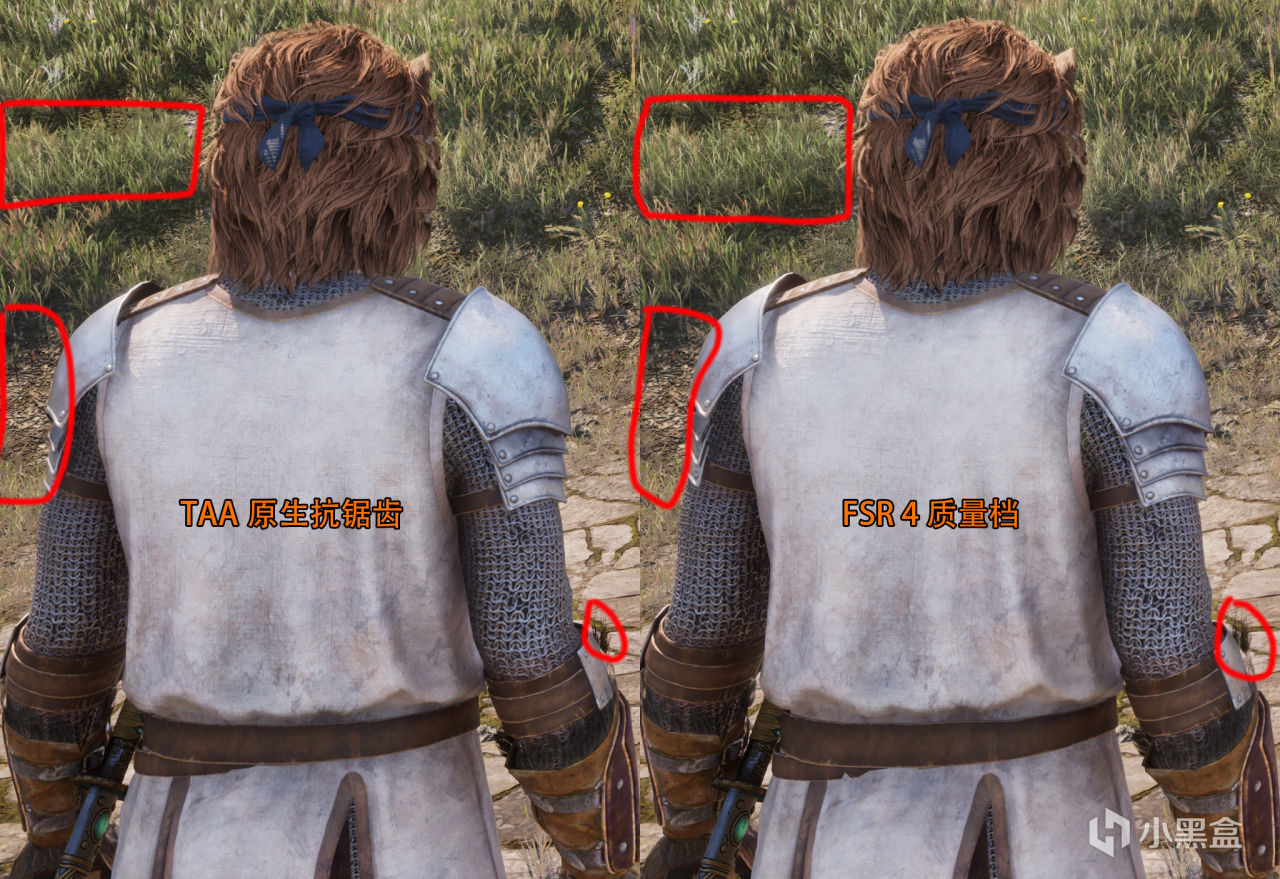 与主流TAA相比,采用CNN模型的FSR 4整体画质更好,尤其是在一些精细物品或者边缘部分上,比如上述画面中红圈位置的草地、铠甲上的毛质区域等,TAA质感有些许模糊,对于毛发处理明显还有粗糙的痕迹,而画面左侧红圈泥土区域,属于玩家不太能注意到的部分,TAA则是优胜一些。