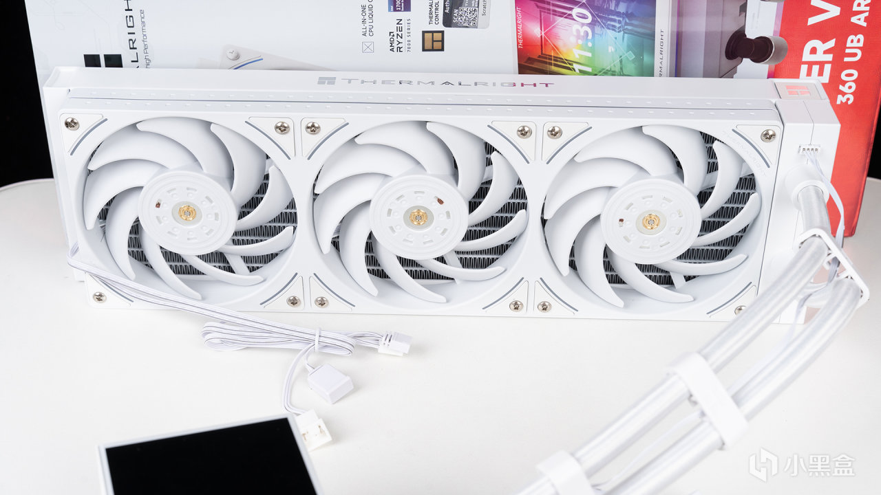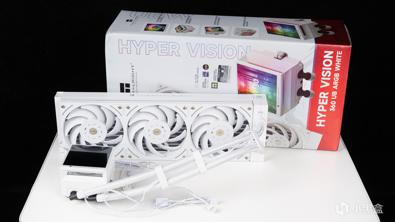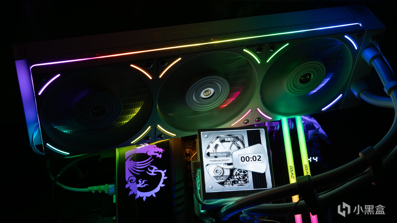 搭载本次显卡测试的CPU是锐龙7 9800X3D,使用利民HYPER VISION 360 UB ARGB终越视界进行压制,定位是自家的高端360水冷。可见水冷已经预装冷排扇,也有附赠导水管卡扣,采用POR冷排独立水泵构架涉及,能大幅优化震动噪声,各位可以参考一下在游戏时CPU的温度和风扇转速表现。