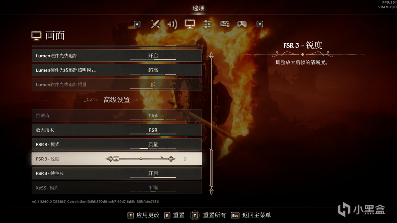《上古卷轴IV:湮灭重制版》拥有NVIDIA DLSS 4、AMD FSR 4和INTEL XeSS三种放大技术支持,其中对于A卡而言,FSR 拥有原生抗锯齿(不缩放)、质量、平衡、性能和超高性能五种档位,也可调整FSR锐度,支持帧生成。游戏本身的抗锯齿则配备FXAA、TAA和TSR(虚幻5引擎特有),下面我们就用FSR 3、FSR 4和TAA三种设置对比下画面差异。