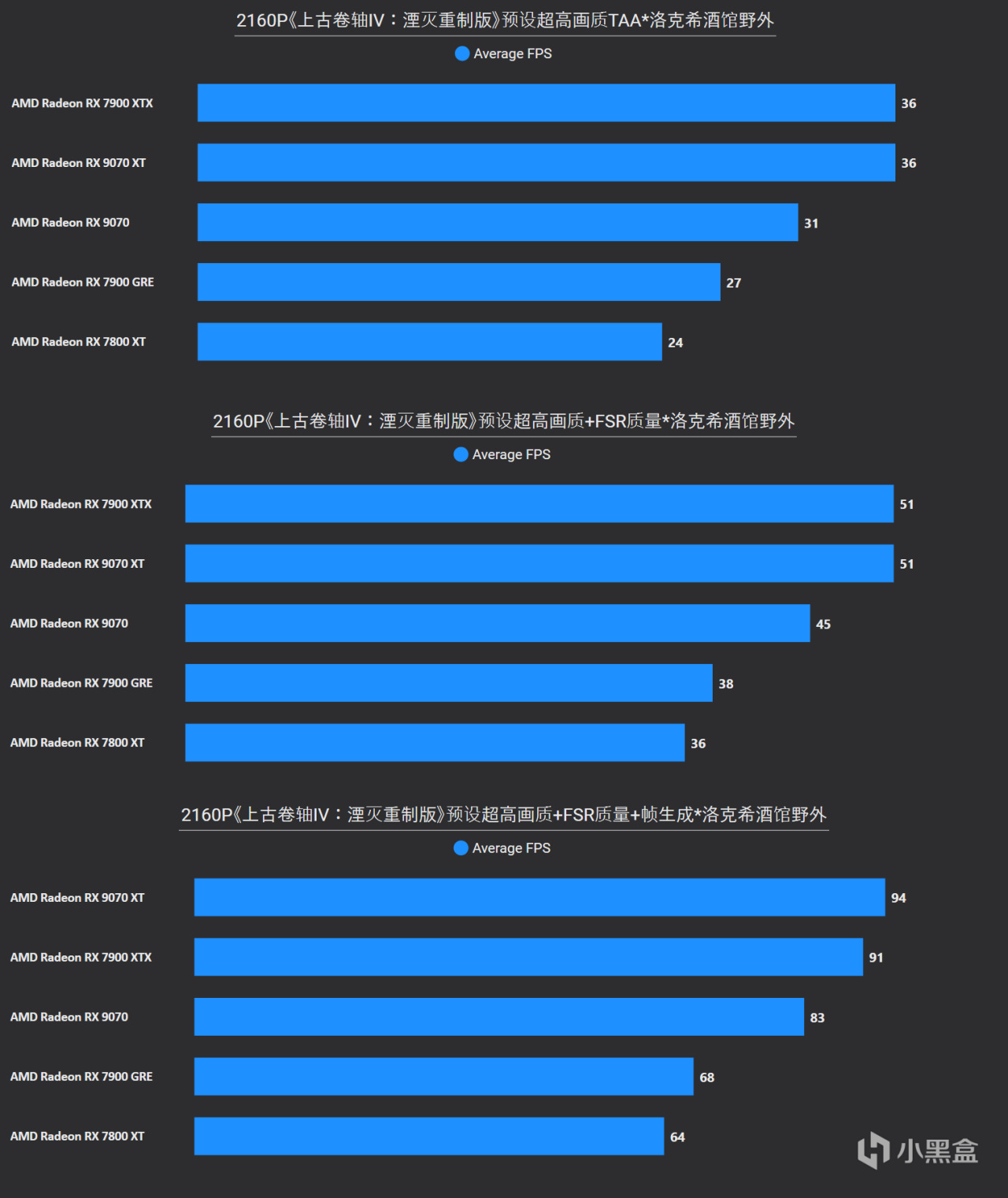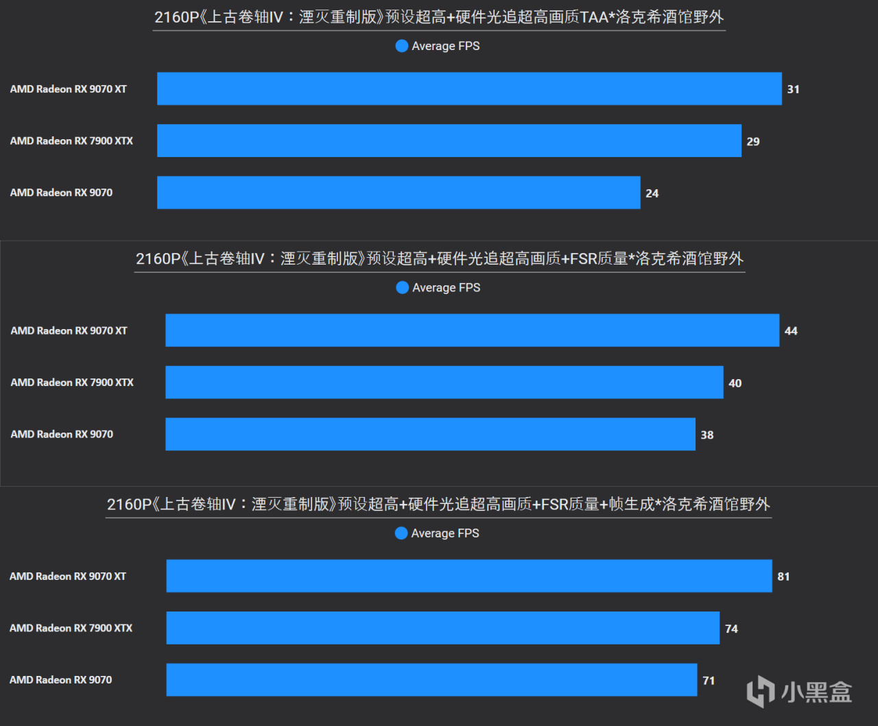 4K拉满画质和光追,难度一下子就上来了,在原生TAA情况下,严格来说只有RX 9070 XT才可达到30fps标准,借助FSR质量档可达到44fps,原始帧勉强够再叠加帧生成也算能接受。而4K对于RX 9070来说,拉满画质(特指光栅部分)压力太大了,就没法像2K分辨率那样反杀RX 7900 XTX了。
