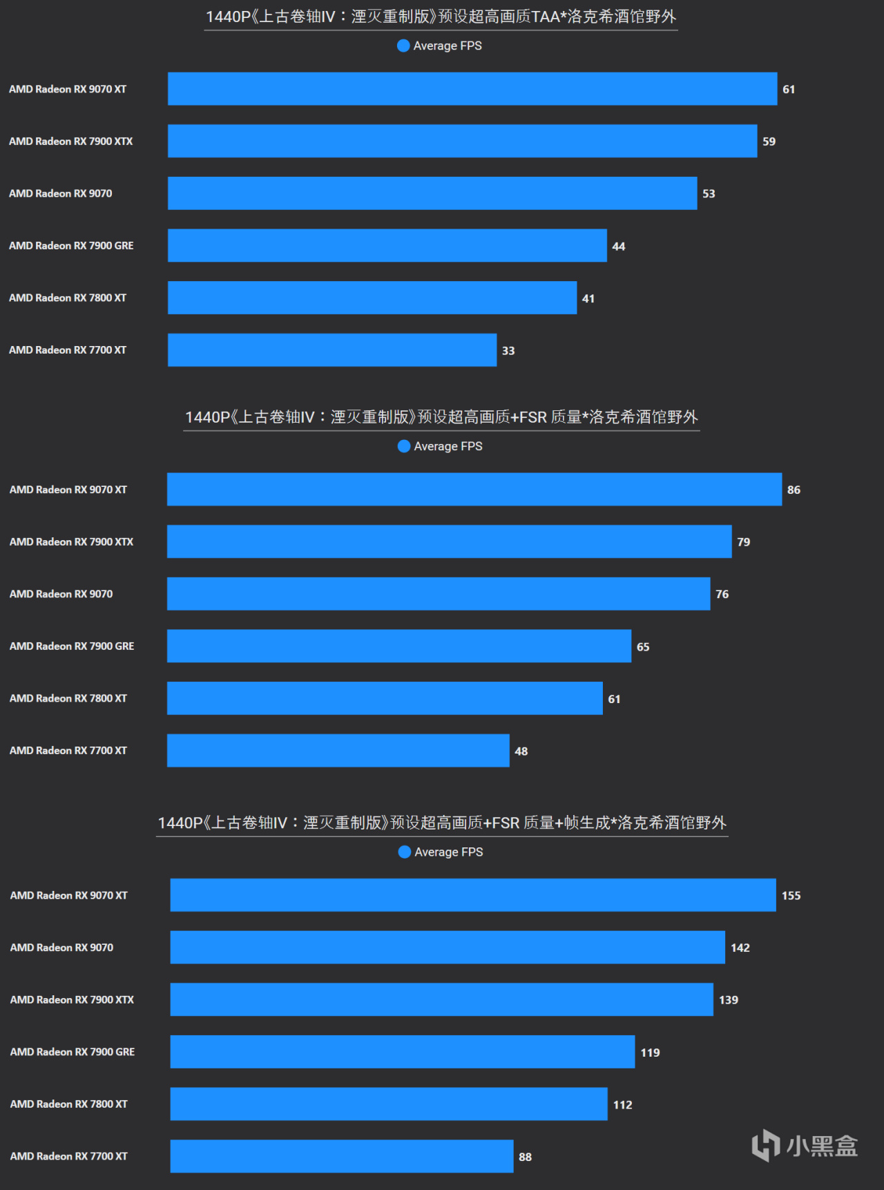至于原生TAA流畅门槛,至少需要RX 9070 XT和RX 7900 XTX,在这游戏里FSR 4表现相当不错,所以降一级到RX 9070已经可以愉快地玩耍。和1080P没有变化的是,RX 9070 XT性能依然是全面超越RX 7900 XTX,而RX 9070在FSR质量+帧生成设置后同样如此。