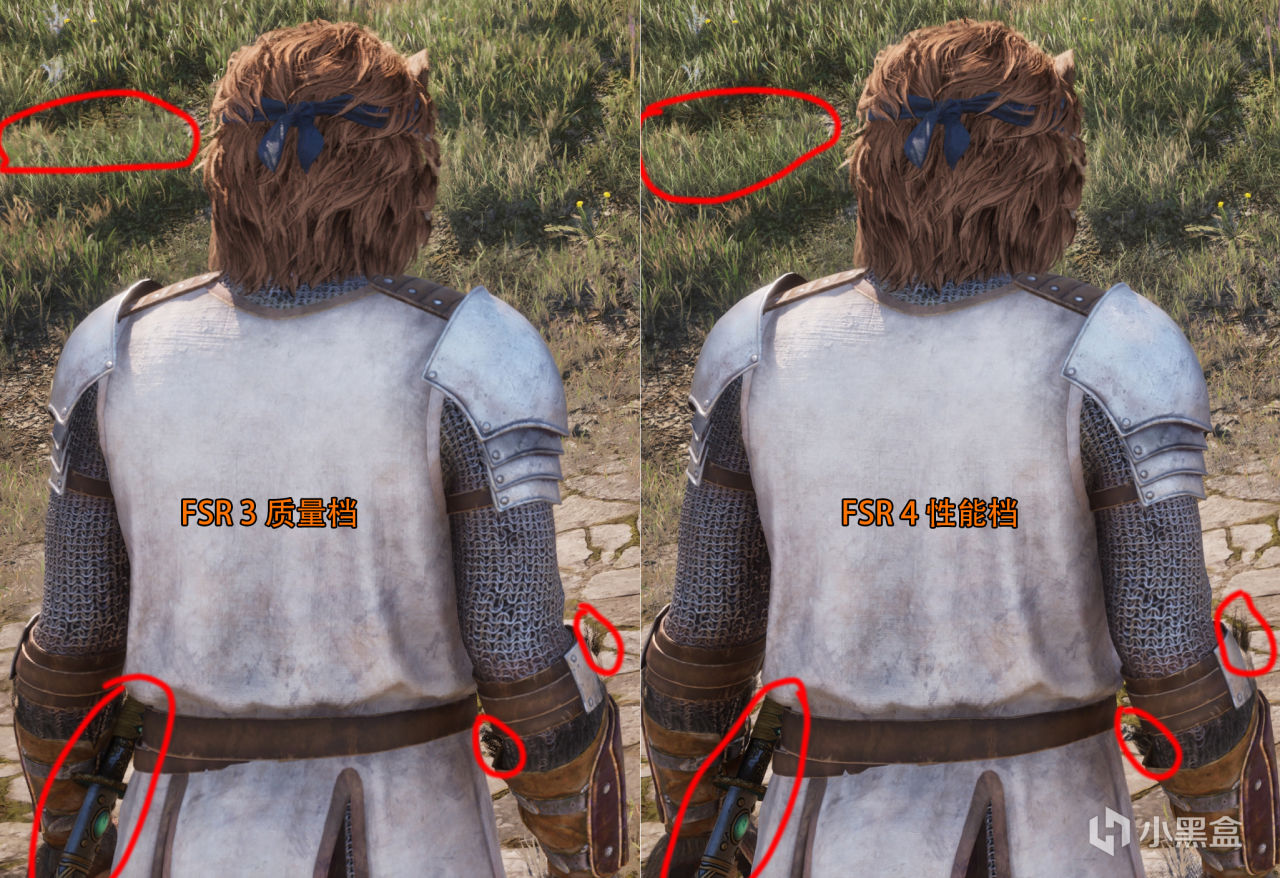 采用时间缩放算法的FSR 3,即便FSR 3使用质量档,画面也是无法比拼FSR 4性能档,毕竟FSR 4有AI模型和ML机器学习训练,除了草地和铠甲毛质区域以外,人物建模质感也更好,尤其是一些可能不被注意的边缘、暗部区域——刀柄部分。更重要的是,FSR 4不仅画质更好,也大大优化了画面中那些可能存在的闪烁和噪点问题。