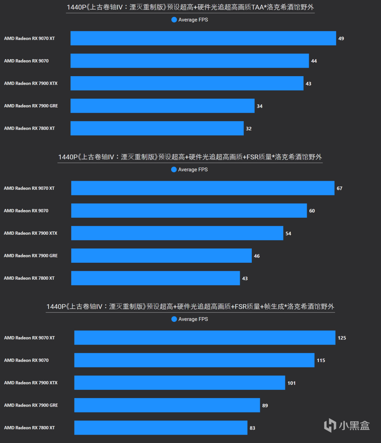 2K拉满画质和光追,RX 9070系列表现还不错,尤其是RX 9070 XT在原生TAA情况下仍达到平均49fps,借助FSR质量档后达到67fps,而RX 9070因为采用更先进的RDNA 4架构和光追单元,在2K这种光栅强度适中的环境,也可全面超越RX 7900 XTX。当然如果是使用FSR这种放大技术,那么RX 7900 GRE也是能勉强满足基本流畅——平均46fps。