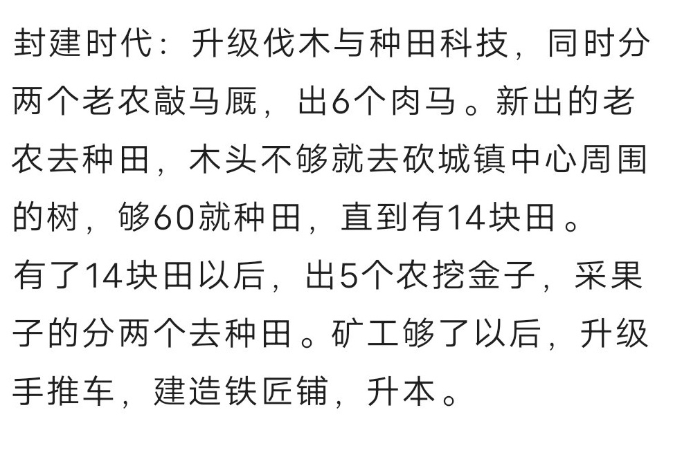 21P封建肉馬,快攻壓制,以攻代守的一個開局,延申變體很多(19P趕鹿肉馬,少出2個伐木農民;蒙古17P速肉馬,因爲蒙古喫鹿快)前期依靠肉馬快速進攻經濟區,拖延對方運營節奏,操作量也小,注意肉馬不要被老農羣毆或者衝進對面城鎮中心下面就行。但是缺點也很明顯,一旦慢了就是血炸開局。所以1V1用這招的基本是配合趕鹿快速喫肉壓上去。