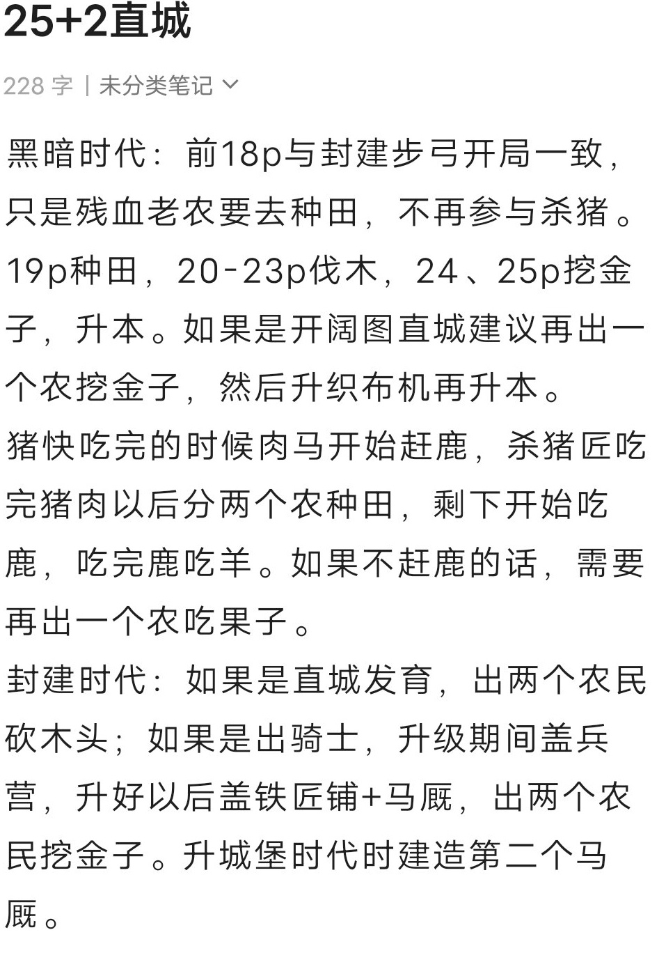 25+2直升城堡時代,常見於海陸混合圖或封閉圖。開闊陸地圖這麼玩的話建議直城騎士,因爲對面壓過來的話需要蓋防禦塔守護資源區,反而沒有蓋城鎮中心的石頭了。