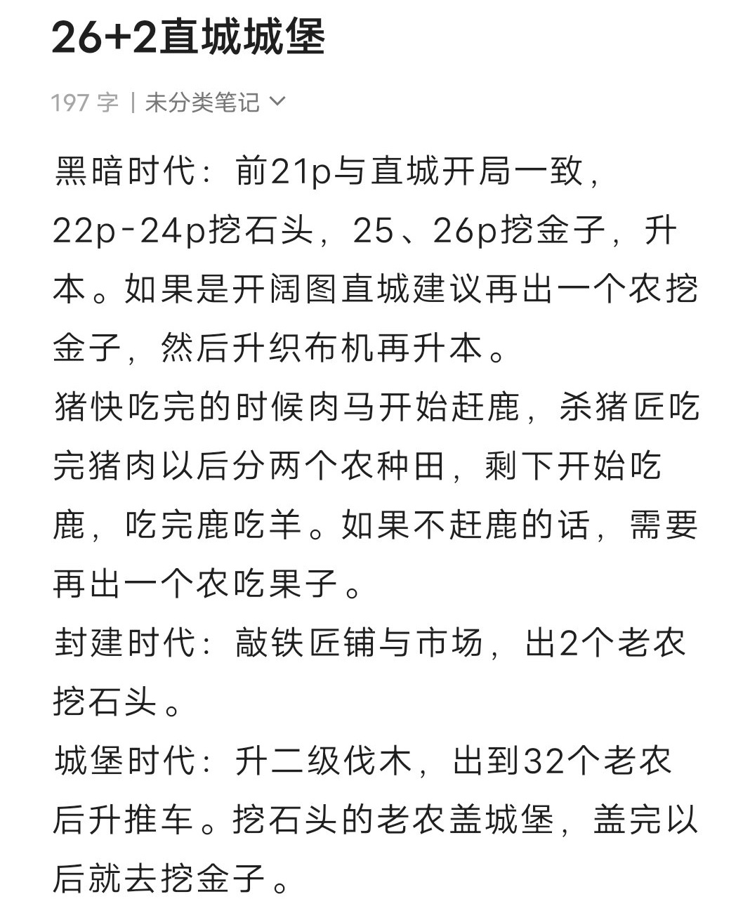 26+2直升城堡時代起城堡,常見於西班牙、土耳其這種城堡兵強勢,科技需求小的民族。開闊陸地圖這麼玩的話需要砸鍋賣鐵,挖夠650石頭就行(不夠可以市場買)。城堡直接敲在城鎮中心和金礦之間起保護作用,再慢慢出兵出農恢復生產。