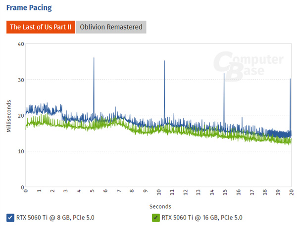從《最後生還者第二部》《上古卷軸4:湮滅重製版》兩款遊戲的幀延遲曲線中,可以明顯看到,RTX 5060 Ti 8GB不但整體延遲偏高,偶爾還會急劇增加,直接表現就是畫面會突然卡住。