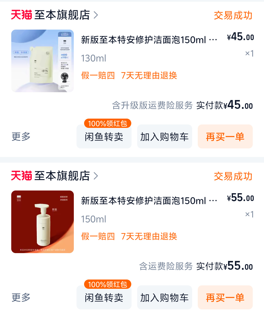 再說說另一款,好像也是樓主目前購買最多的一款(我自己沒看購買記錄都不相信我買了兩次補充裝),這一款和前面一款比起來,個人覺得最大的不同就是它是按出來就是已經打好的泡沫了,可以不用起泡網了,但是這一款有一個問題,這也是樓主最後又沒有再次復購的原因,不知道爲什麼樓主最後一次買的時候感覺變質了,有異味(這裏說明一下不是買的時候有異味,樓主最後是 24 年七月底買的,可能是溫度過高,導致使用沒半個月之後有異味?不過用起來沒有什麼不一樣,但是這個味道聞起來樓主不喜歡(´・_・`))
