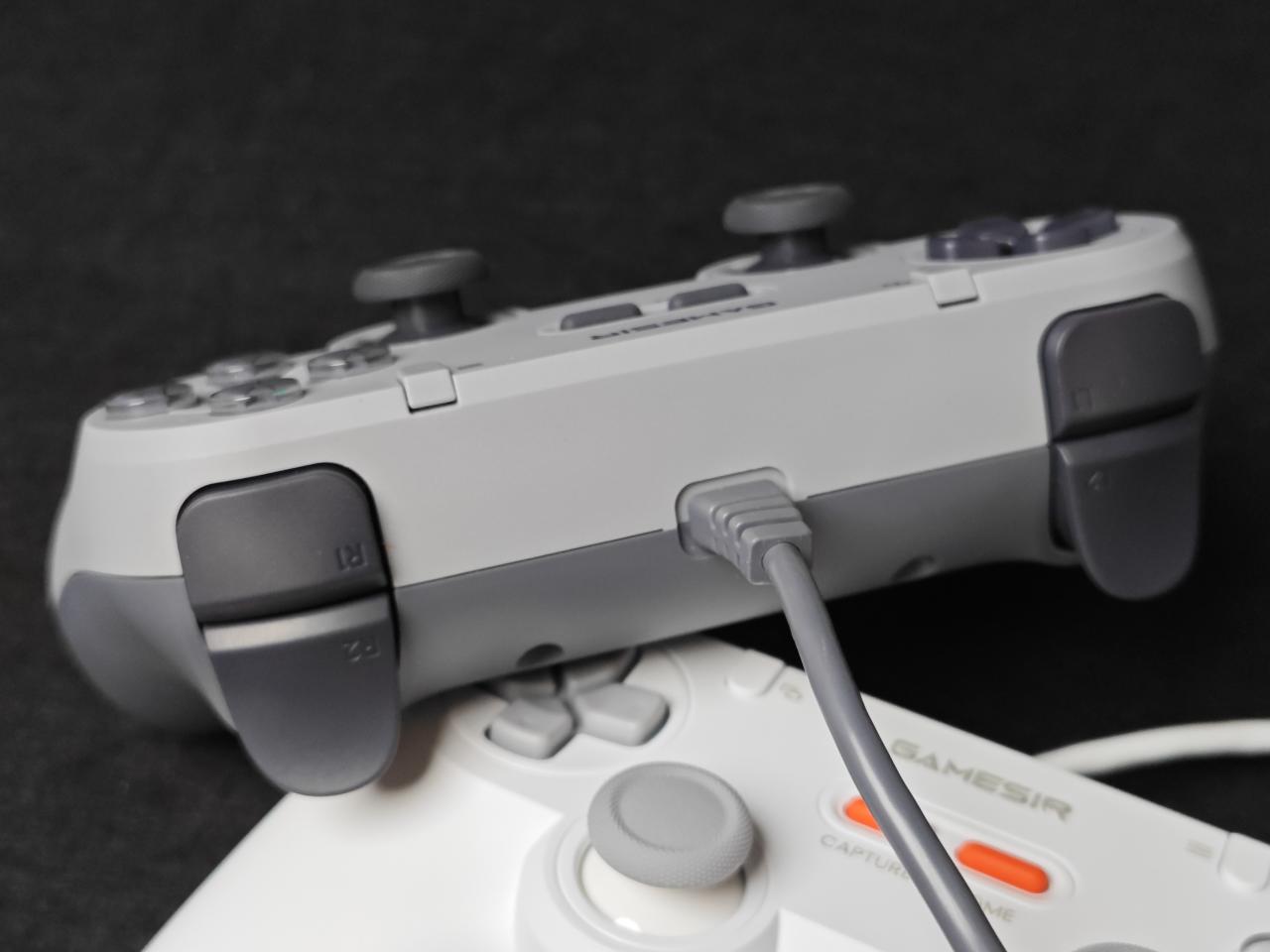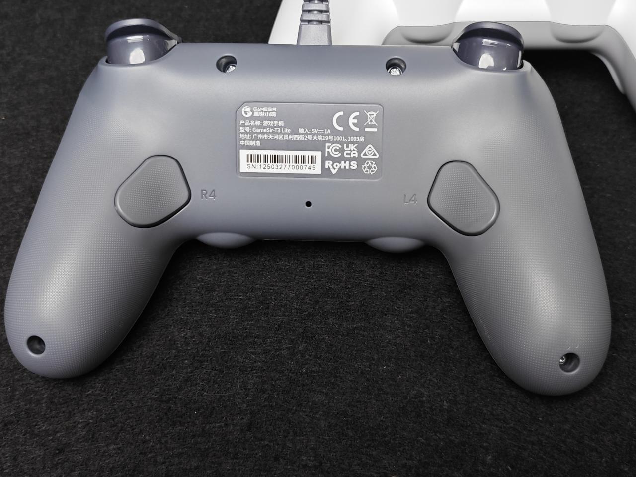 手柄背面做的非常乾淨,他的握把處做了防滑激光紋,防滑紋深度較淺,不容易刮泥,非常好清潔。且背面還帶了兩顆支持宏的自定義背鍵,對於這個價位的手柄來說,確實非常稀奇。背鍵爲輕觸開關,握持的時候按鍵剛好位於中指位置,設置也非常合理,非常好觸發。