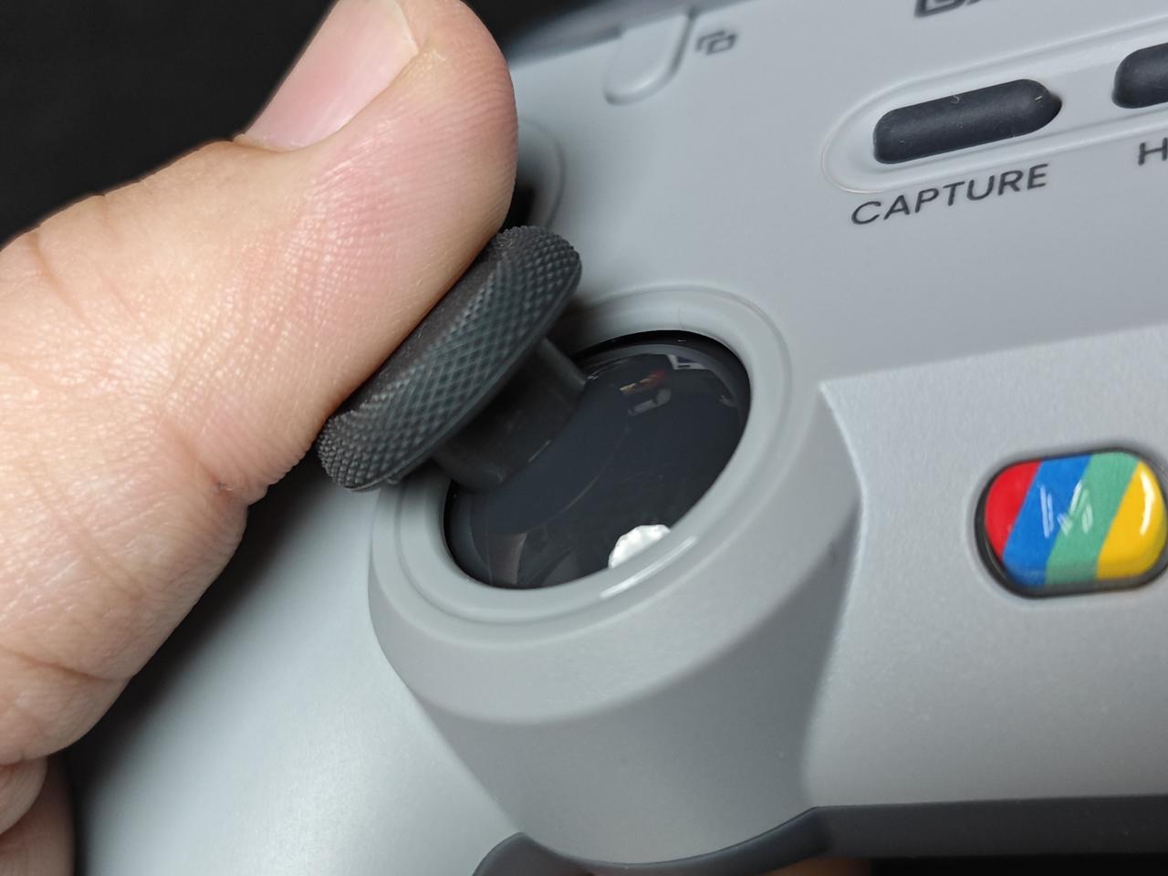 靈狐的雙搖桿均採用500萬次壽命的霍爾搖桿,霍爾搖桿的優點大家都知道,無物理接觸的特性讓它比傳統的碳膜搖桿壽命更高。搖桿推動非常順滑,推動阻尼非常均勻,中心點也不是特別緊,非常好推開,控制性很強。手柄默認爲圓形外圈調教,帶5%的死區,可切換爲0死區的方形外圈。爲了讓手柄搖桿更加耐用,靈狐的搖桿外圈加了防磨pom環。價格雖然低,但在設計方面依舊貼心。