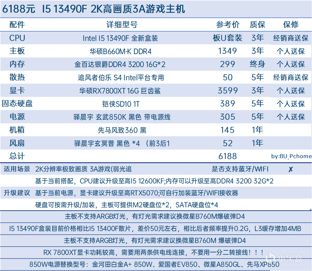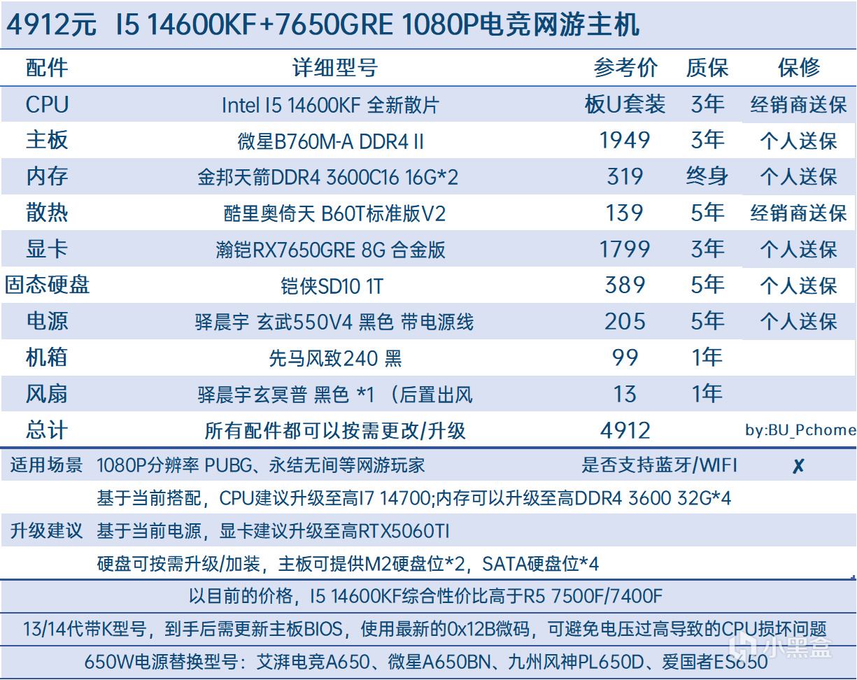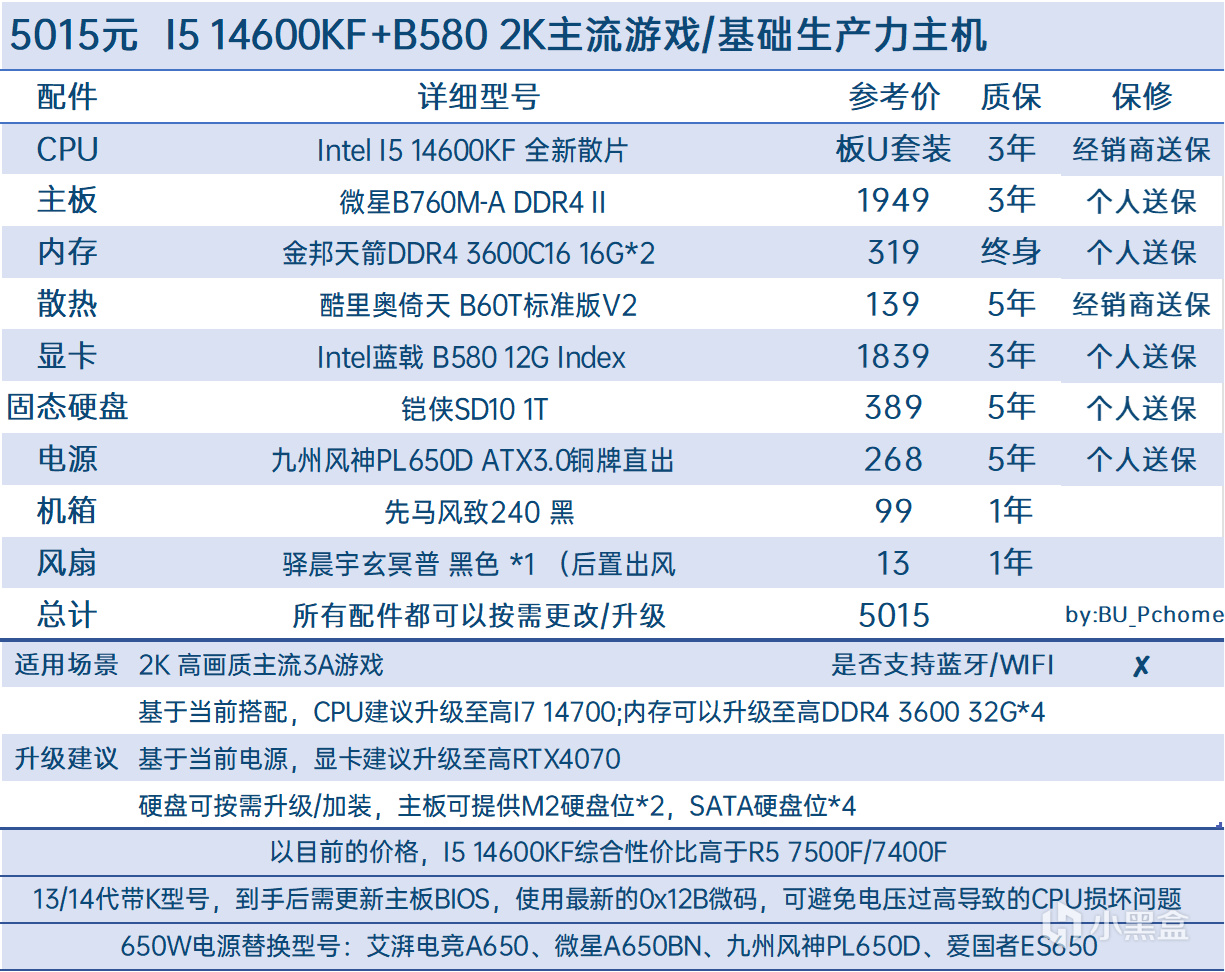 2. 關於電源:如果覺得我給的電源檔次偏低,自己可以加錢換其他型號,更換顯卡時請務必關注電源是否夠用/機箱兼容性
