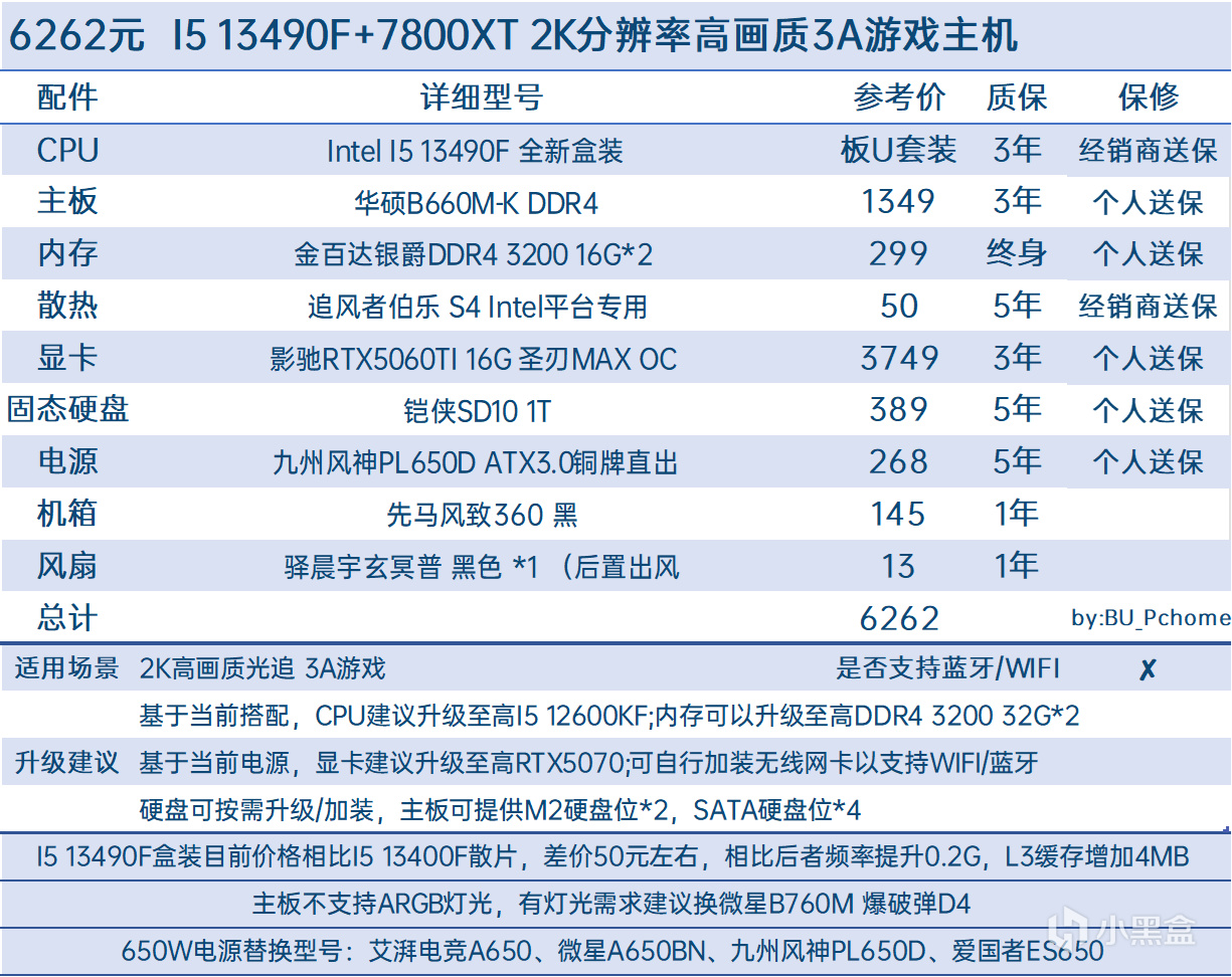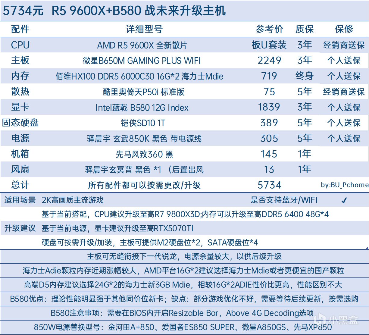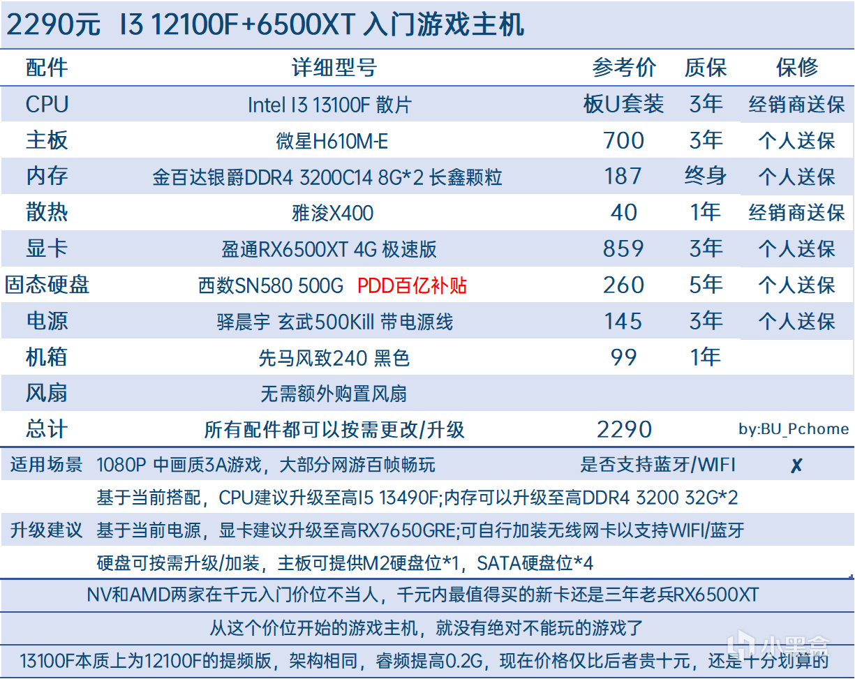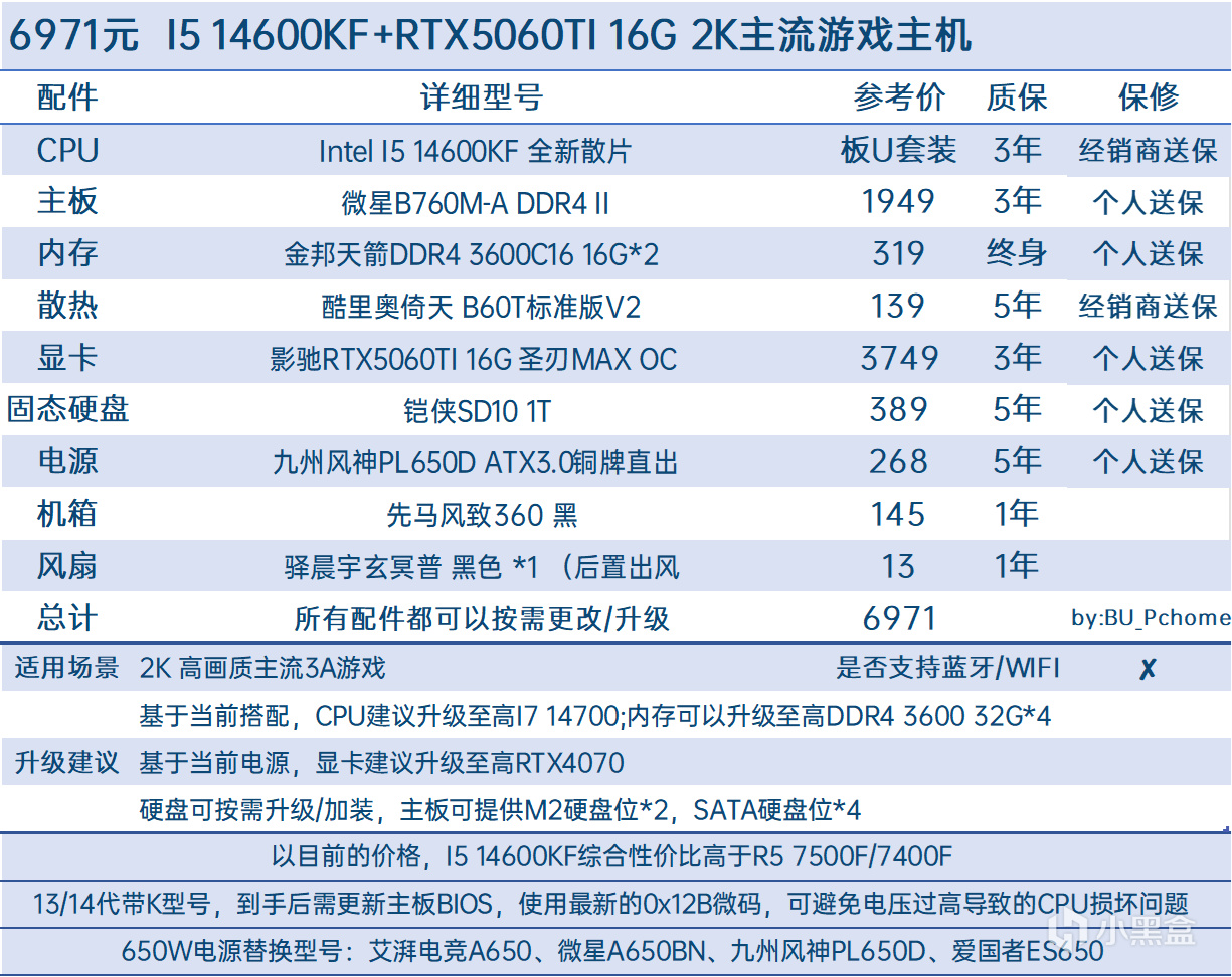 2. 關於電源:如果覺得我給的電源檔次偏低,自己可以加錢換其他型號,更換顯卡時請務必關注電源是否夠用/機箱兼容性