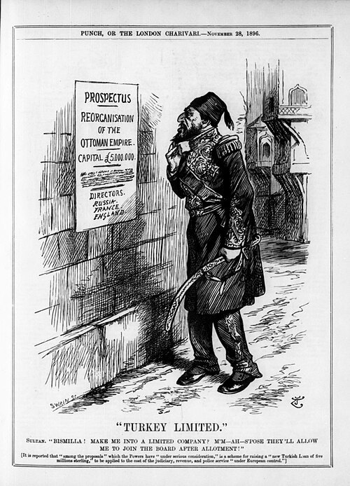 蘇丹站在宣佈奧斯曼重組的海報前,俄羅斯、法國和英國被列爲重組的董事。諷刺當時奧斯曼帝國經濟的貧困狀態。