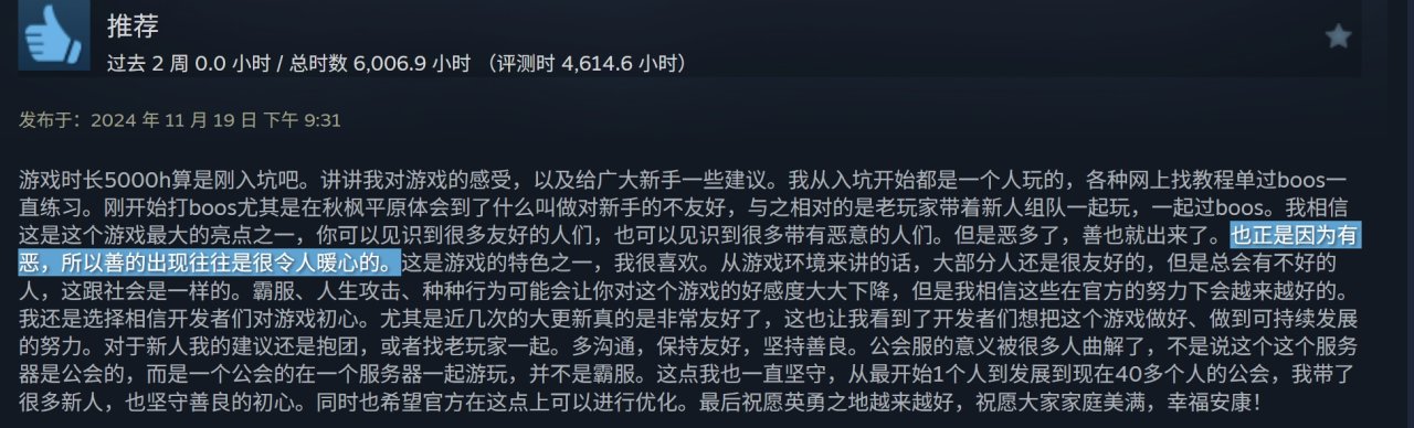 如Steam評論區諸多差評所言:這是一款高度自由的遊戲,會有惡意PVP、公會霸服、偷子搶BOSS,也有追殺復仇、生存競爭和資源搶奪。