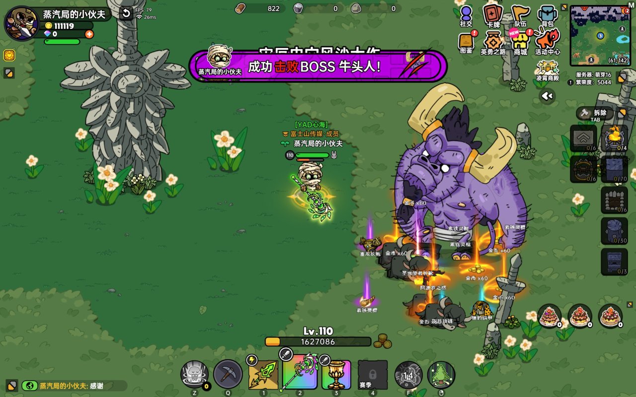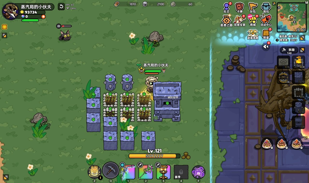 找個偏僻或者離安全區近的角落,從伐木採石挖礦開始,建造尖刺箭塔防禦,六塊田自動長出“經驗值”,靠近篝火能回血
