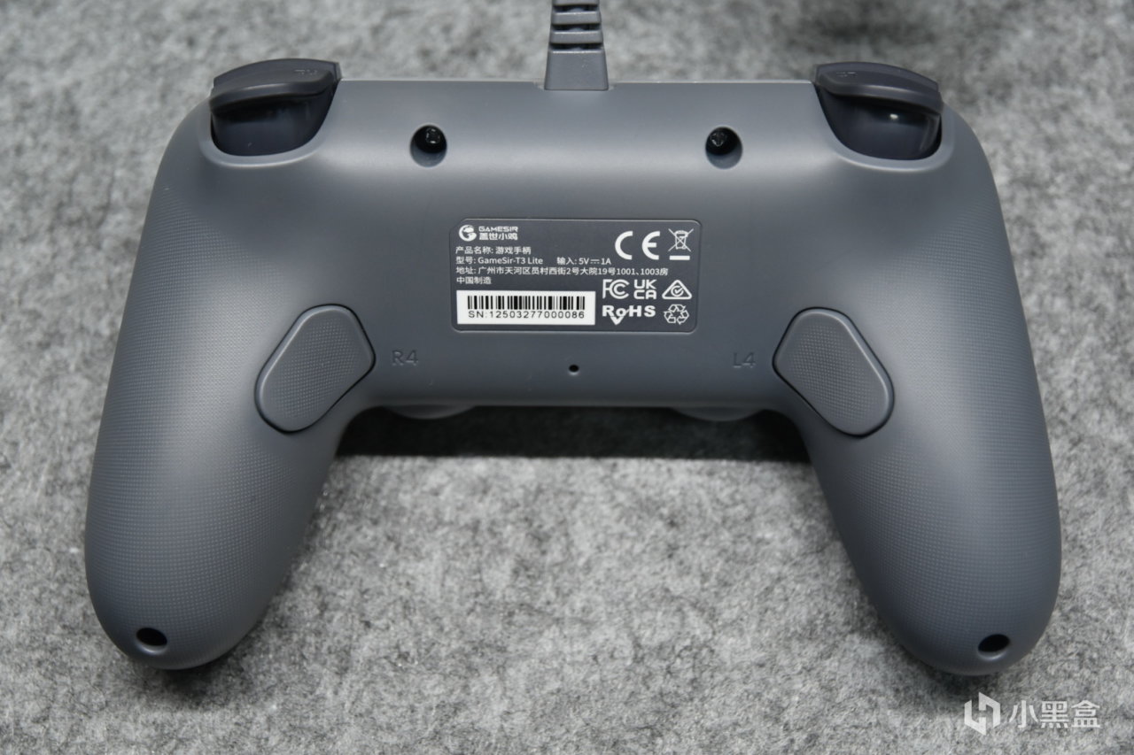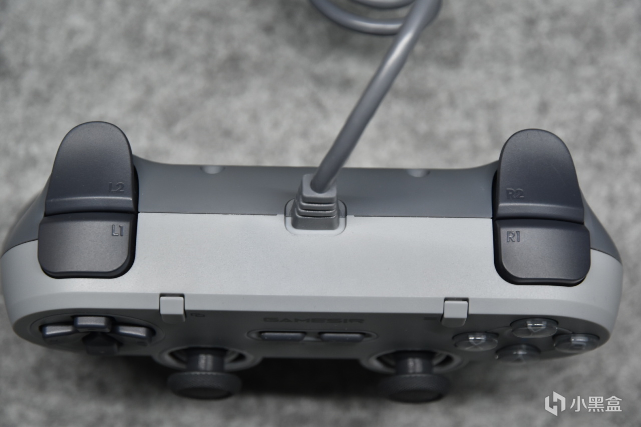 手柄頂部與PS手柄較爲相似,線材與手柄連接的地方做了保護處理,肩鍵寬大,按壓力度輕。扳機上手柄採用了碳膜扳機,手感稍肉,整體行程線性,變化均勻。