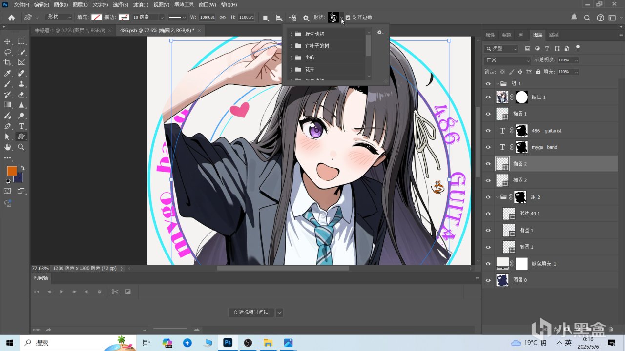 這個時候就差不多OK了,如果你覺得單調,還可以選擇左邊的“自定義形狀工具”,點擊上方“形狀”選擇自己喜歡的一個文字圖案或者徽章logo自行添加。