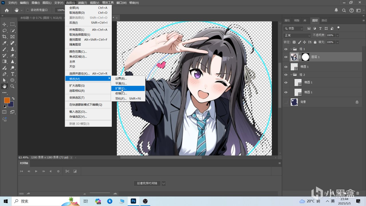 這時候你會發現人物和圓圈有重疊部分,“CTRL+左鍵”選中人物圖層,點擊上方“選擇”→“修改”→“擴展”。(修改擴展大小爲5,小於5的縮小1點即可)。