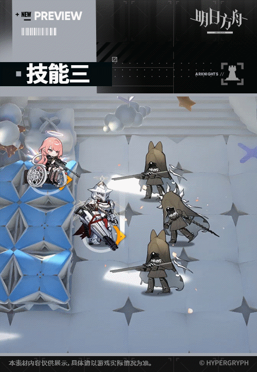 三技能很有說法,方舟第一個彈藥拐,是一個不錯的技能,能給拉特蘭幹員補充彈藥,新約能天使,蕾繆安,聖葬都能喫到該效果,(順帶一提不是無限補充最多補充目標子彈上限彈藥量)全面提升生命值攻擊力防禦力,輸出方面由於攻擊方式改爲受到攻擊反擊,那打龐貝就是好手了。