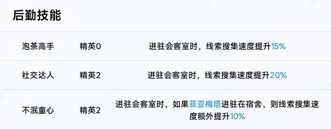 每次造成傷害使自身10少內防禦力+50,攻擊速度+5,最多可盈加3層;層數盈滿時,使場上所有【拉待蘭】幹員的攻擊速度不會低於戰鬥開始時的攻擊速度