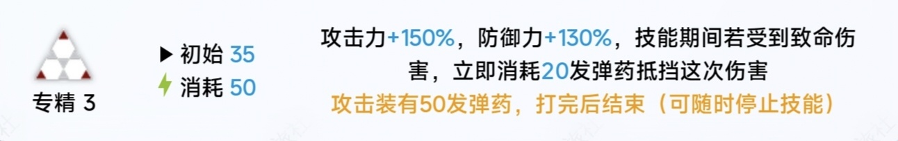這個技能是個強化擊一類的輸出技能,但實際傷害不高,能爲拉特蘭幹員補充彈藥,但有毒點,一個是受擊回覆,另一個是CD,實際能補充的彈藥不多,肉鴿或者未來有能對上軸的拉特蘭幹員的話會有大用,目前作用不大,不推薦專。